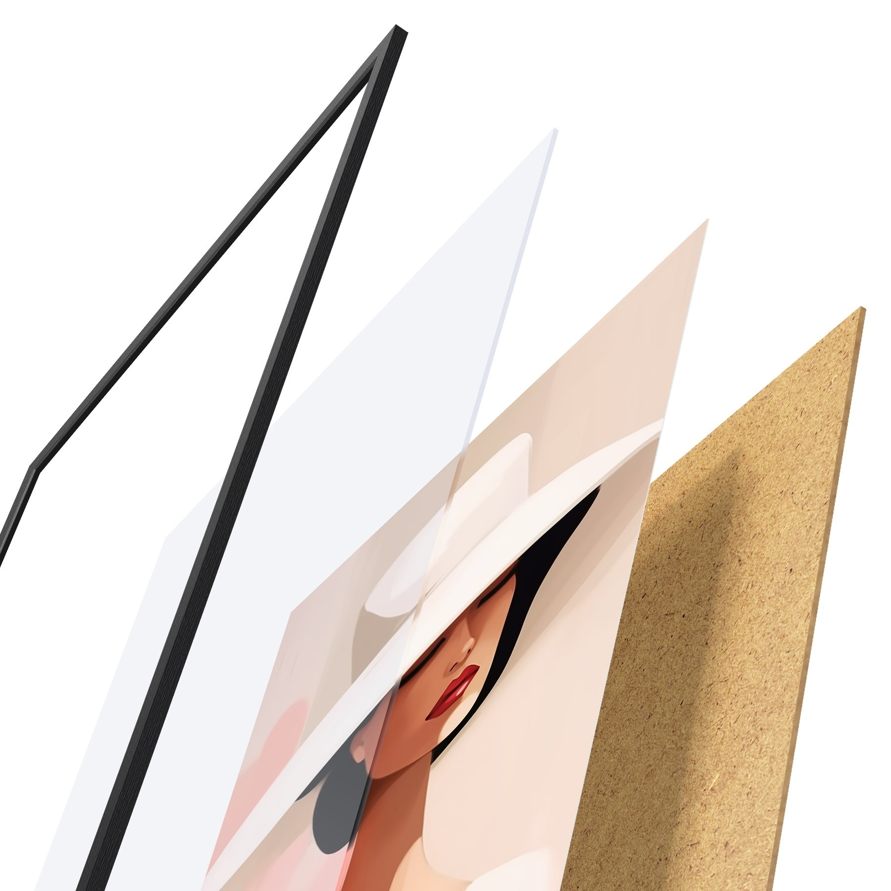 Plakat składa się z ramy, pleksi, wydrukowanego obrazu i podkładu z płyty wiórowej. Plakat można natychmiast zawiesić na ścianie dzięki uchwytom z tyłu.