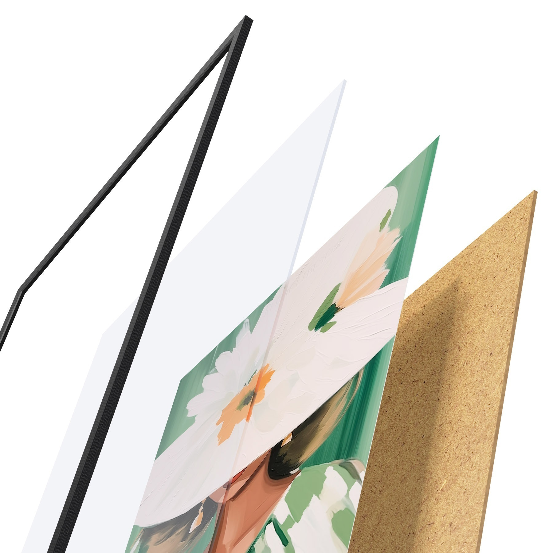 Plakat składa się z ramy, pleksi, wydrukowanego obrazu i podkładu z płyty wiórowej. Plakat można natychmiast zawiesić na ścianie dzięki uchwytom z tyłu.