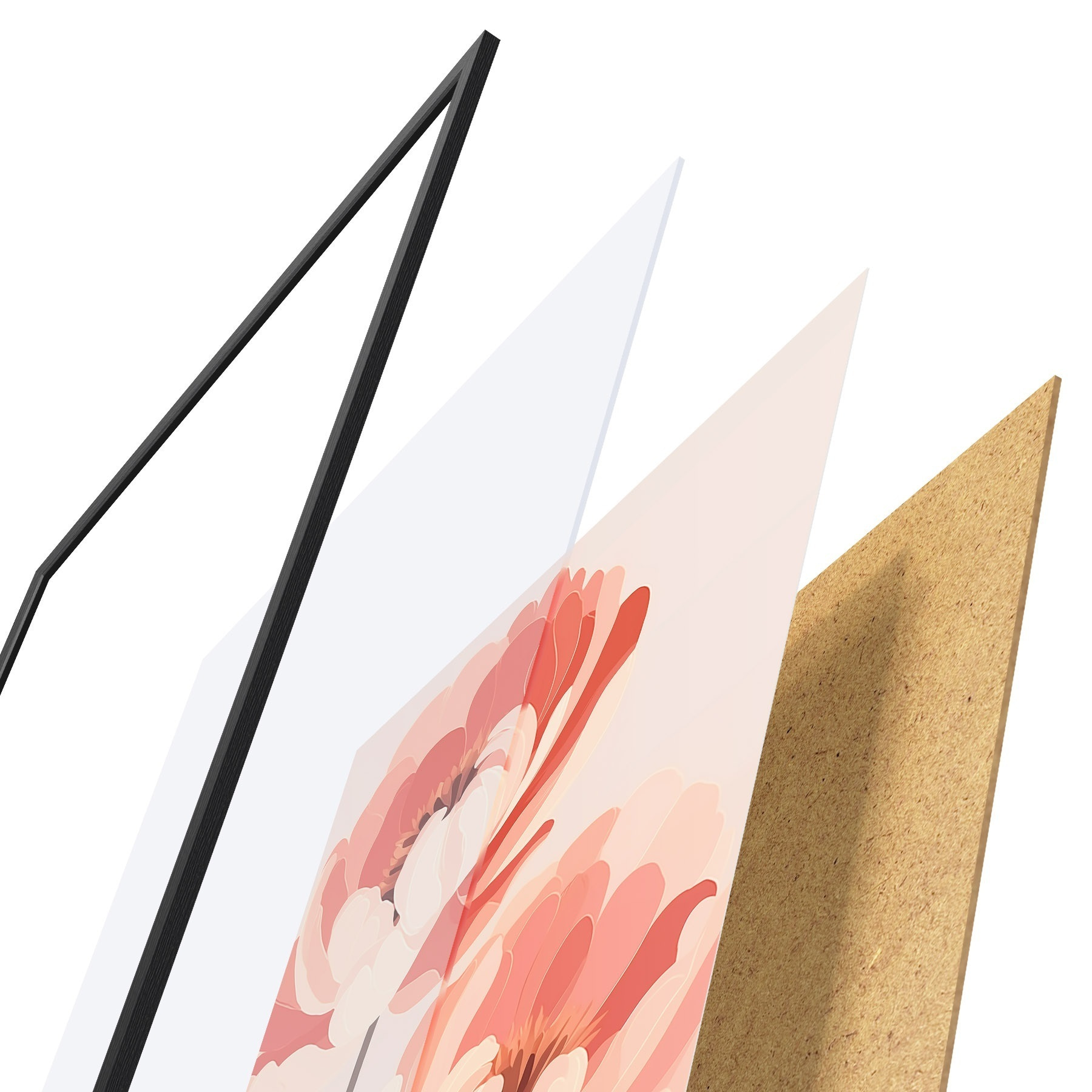 Plakat składa się z ramy, pleksi, wydrukowanego obrazu i podkładu z płyty wiórowej. Plakat można natychmiast zawiesić na ścianie dzięki uchwytom z tyłu.