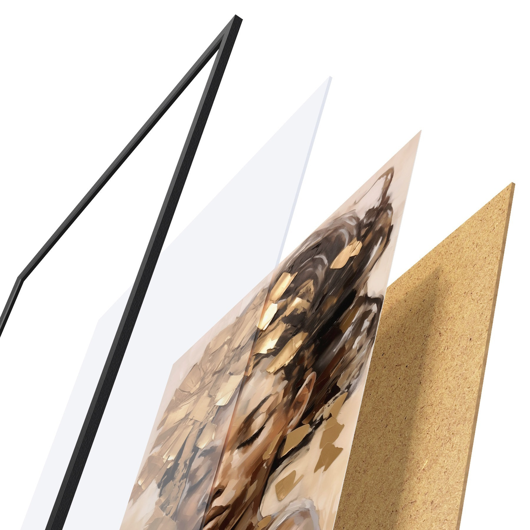 Plakat składa się z ramy, pleksi, wydrukowanego obrazu i podkładu z płyty wiórowej. Plakat można natychmiast zawiesić na ścianie dzięki uchwytom z tyłu.