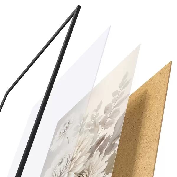Plakat składa się z ramy, pleksi, wydrukowanego obrazu i podkładu z płyty wiórowej. Plakat można natychmiast zawiesić na ścianie dzięki uchwytom z tyłu.