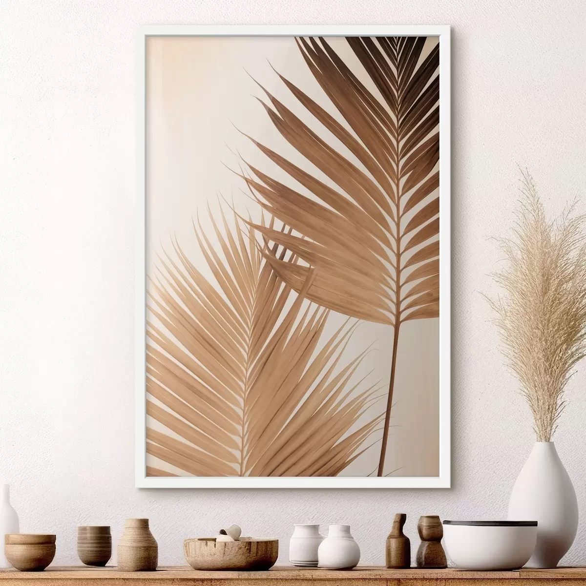 Poster Liście palmowe w brązowych odcieniach, neutralne tło, minimalistyczny styl, naturalne oświetlenie, tropikalny klimat Nr f46274