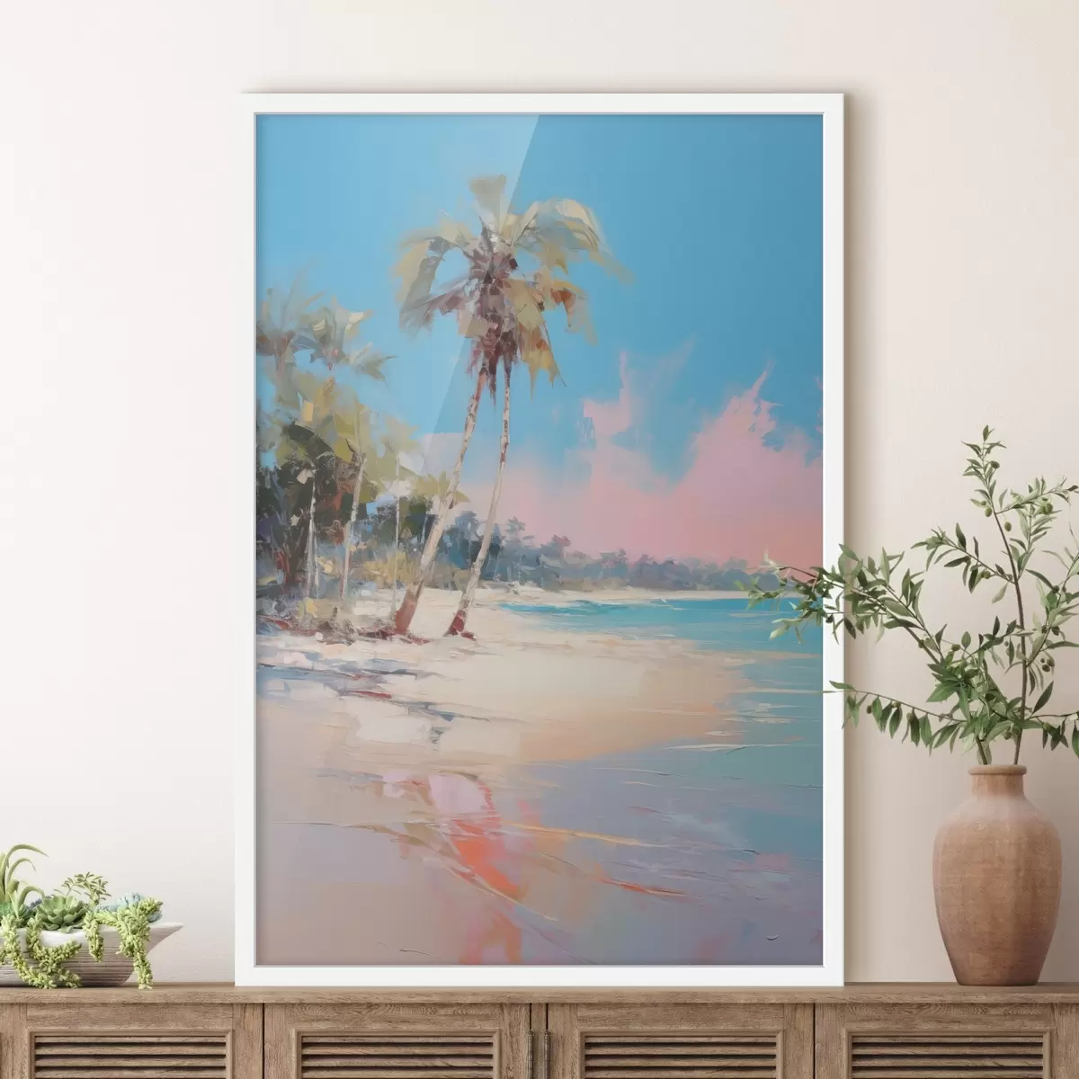 Plakat Abstrakcyjna tropikalna plaża z białym piaskiem i palmami, błękitne niebo z białymi chmurami f46285