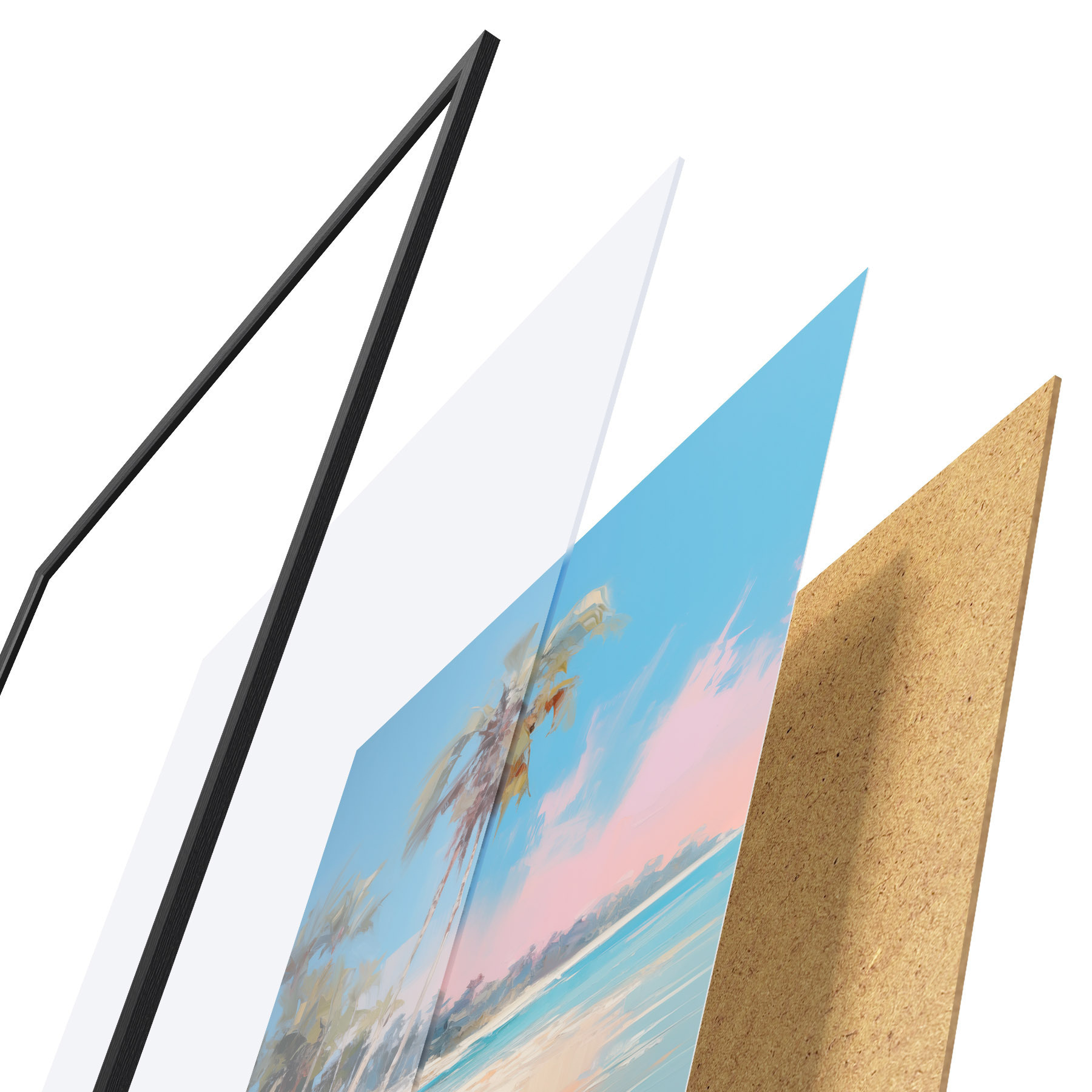 Plakat składa się z ramy, pleksi, wydrukowanego obrazu i podkładu z płyty wiórowej. Plakat można natychmiast zawiesić na ścianie dzięki uchwytom z tyłu.