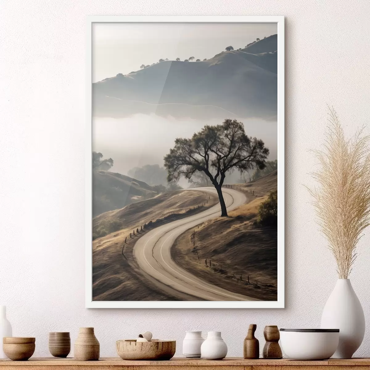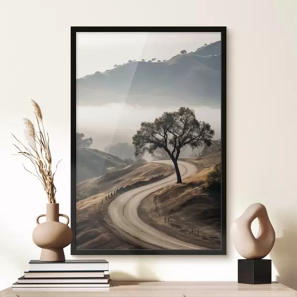 Plakat Kręta droga wśród falistych wzgórz z drzewem na pierwszym planie, w tle mgła i góry f46288