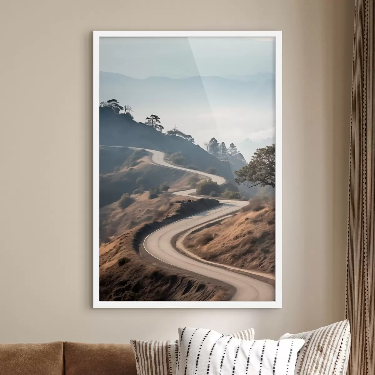 Plakat Kręta droga przez pagórkowaty krajobraz z suchą trawą pod czystym niebem, z górami w oddali f46289
