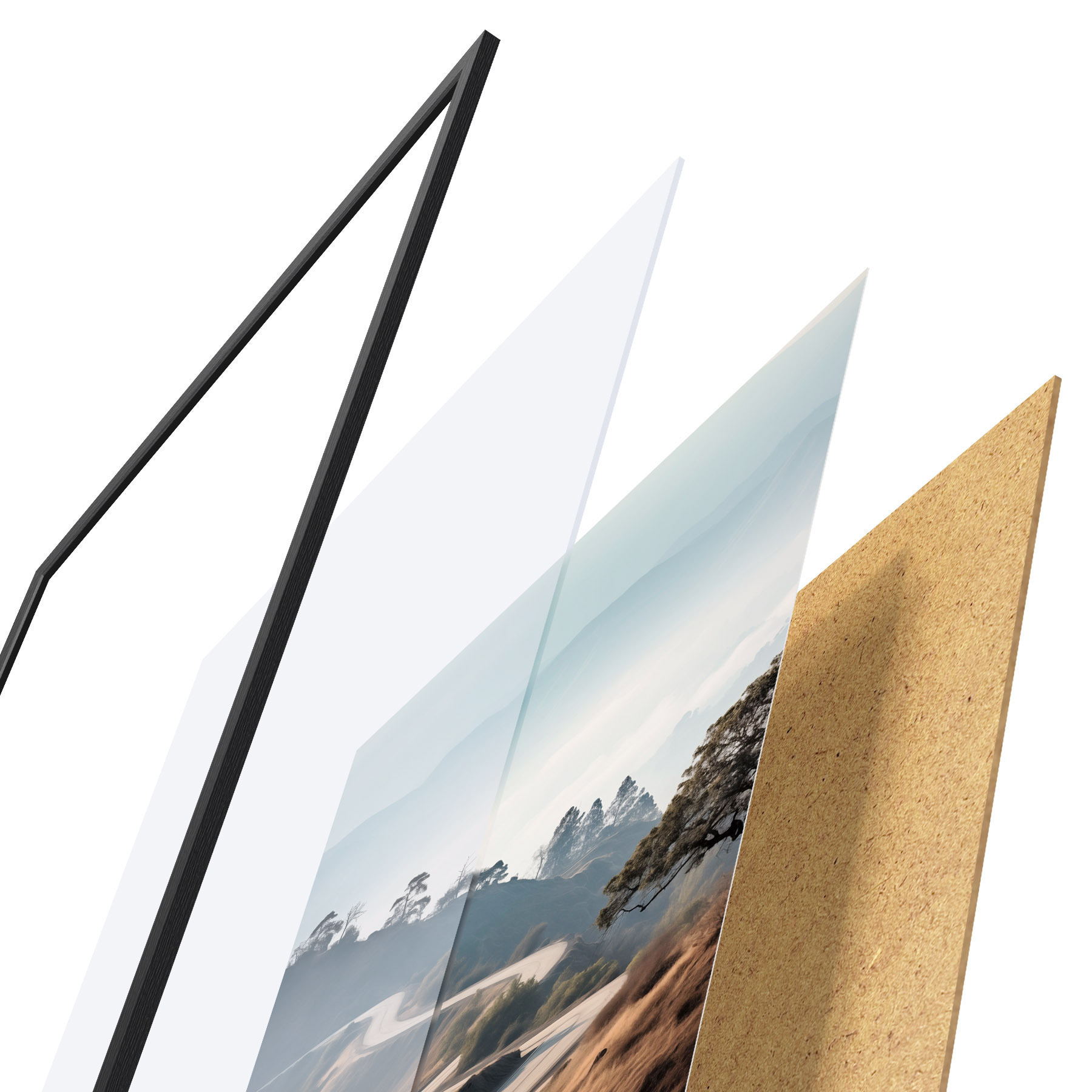 Plakat składa się z ramy, pleksi, wydrukowanego obrazu i podkładu z płyty wiórowej. Plakat można natychmiast zawiesić na ścianie dzięki uchwytom z tyłu.