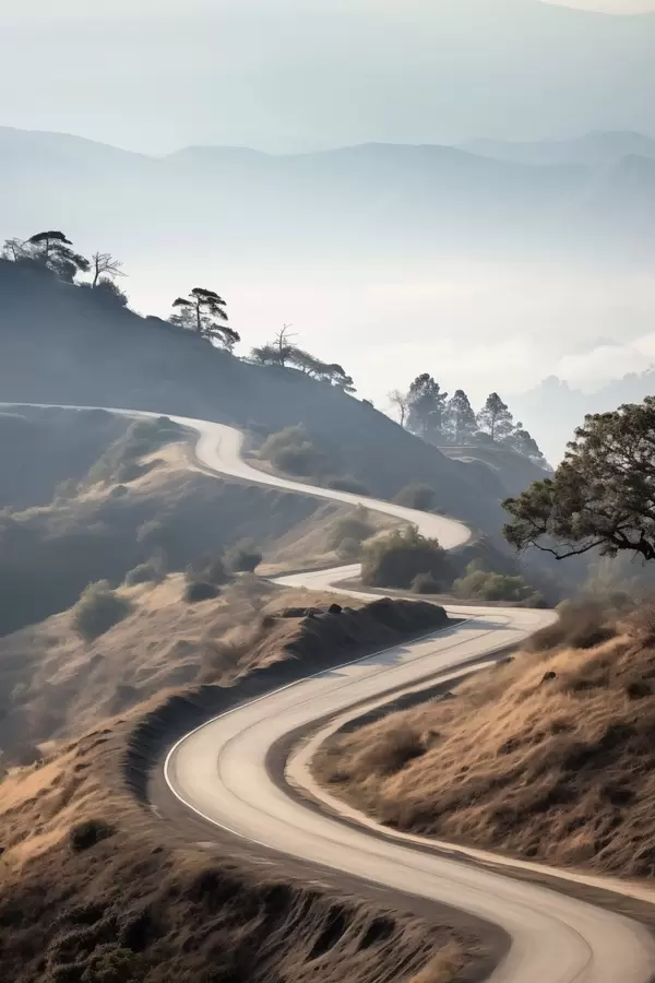 Poster Kręta droga przez pagórkowaty krajobraz z suchą trawą pod czystym niebem, z górami w oddali Nr f46289