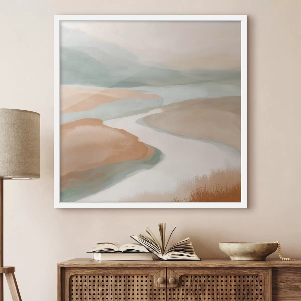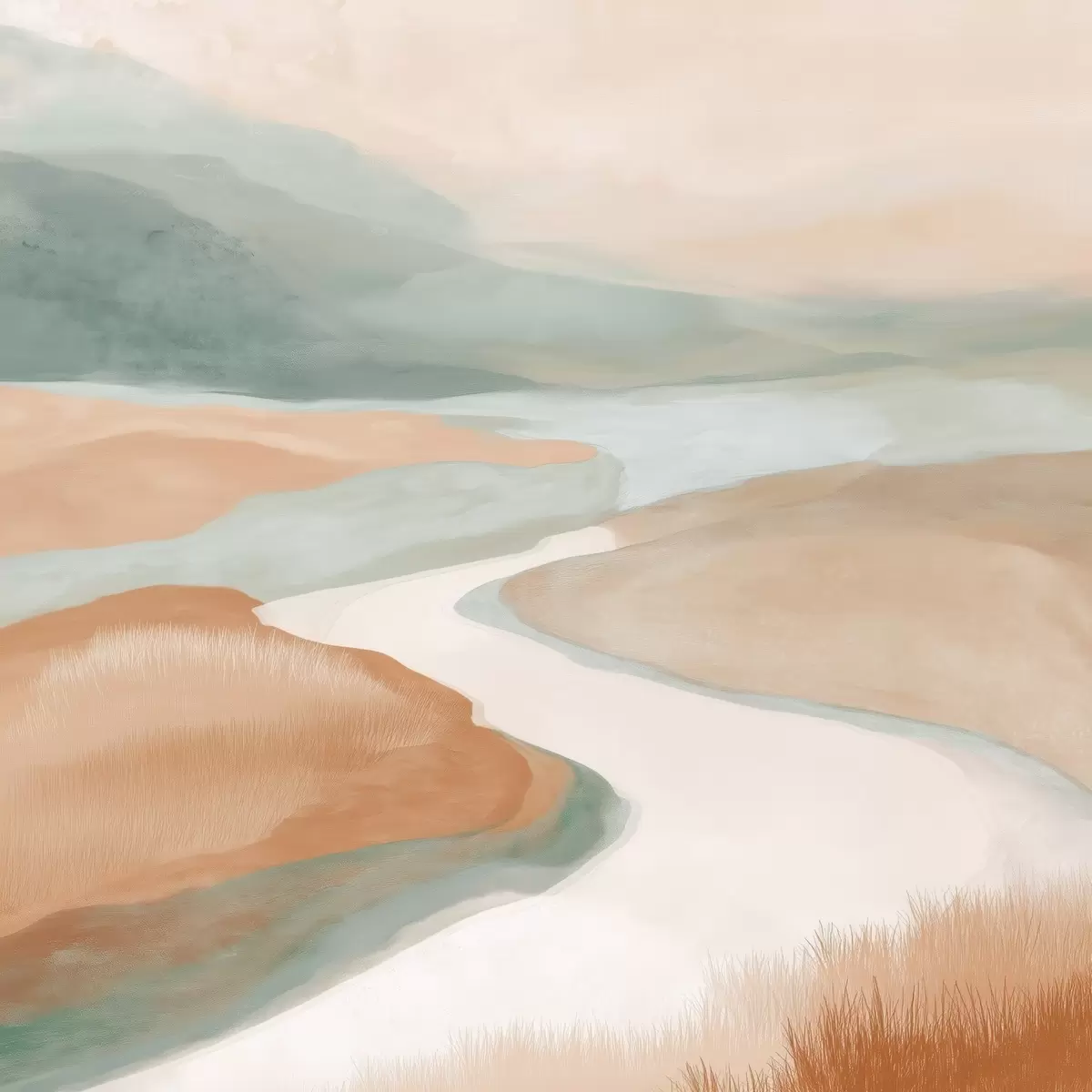 Plakat Abstrakcyjny krajobraz z rzeką w kolorach pomarańczowym i zielonym f46316