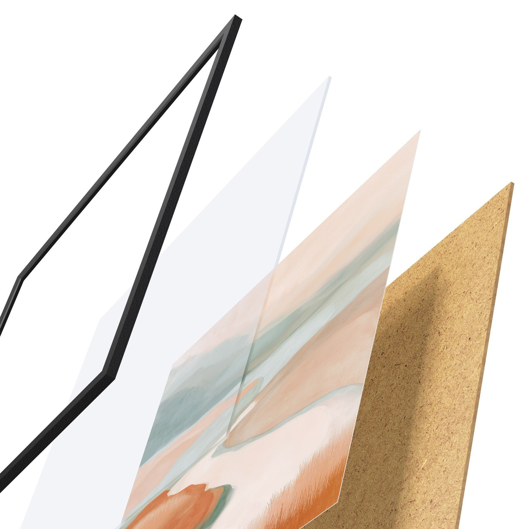 Plakat składa się z ramy, pleksi, wydrukowanego obrazu i podkładu z płyty wiórowej. Plakat można natychmiast zawiesić na ścianie dzięki uchwytom z tyłu.