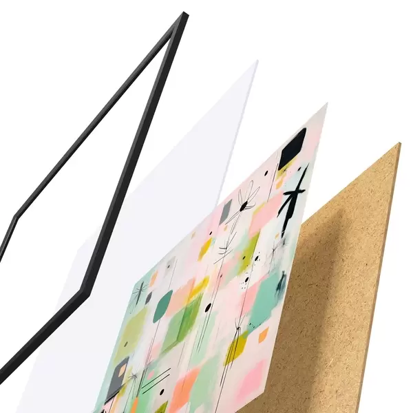 Plakat składa się z ramy, pleksi, wydrukowanego obrazu i podkładu z płyty wiórowej. Plakat można natychmiast zawiesić na ścianie dzięki uchwytom z tyłu.