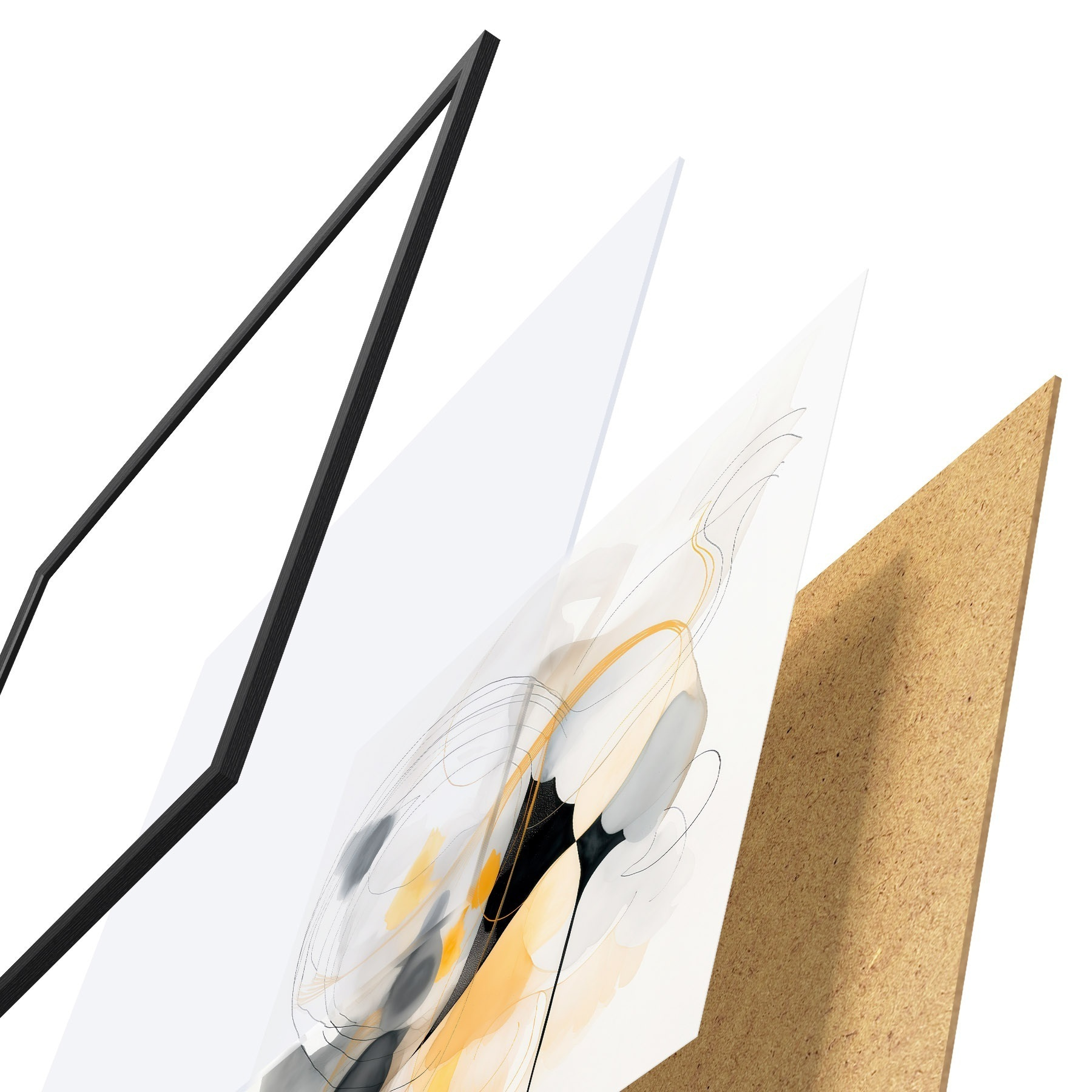 Plakat składa się z ramy, pleksi, wydrukowanego obrazu i podkładu z płyty wiórowej. Plakat można natychmiast zawiesić na ścianie dzięki uchwytom z tyłu.