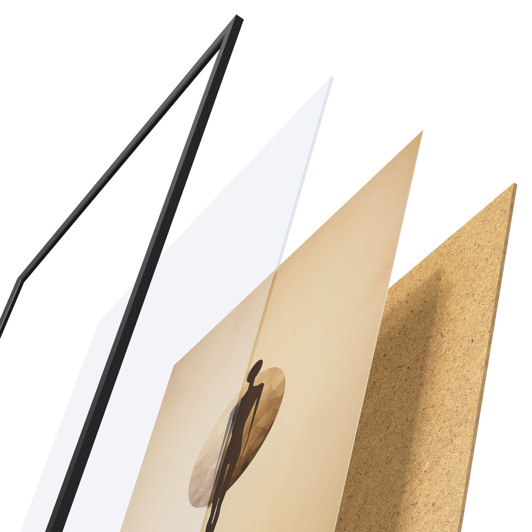 Plakat składa się z ramy, pleksi, wydrukowanego obrazu i podkładu z płyty wiórowej. Plakat można natychmiast zawiesić na ścianie dzięki uchwytom z tyłu.