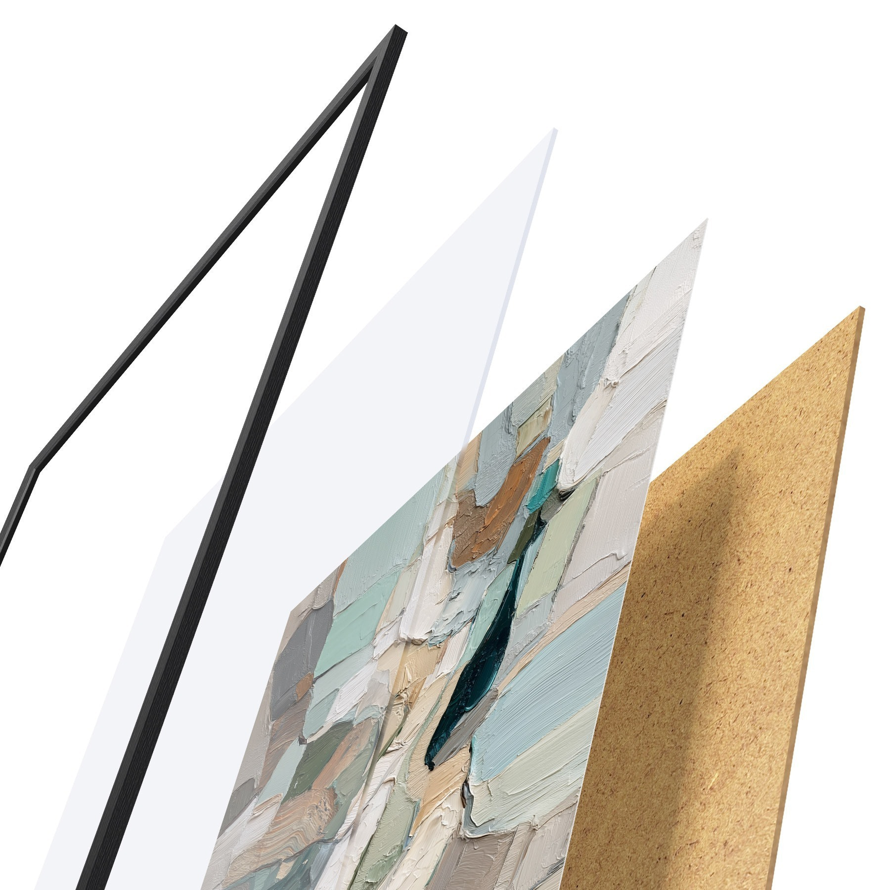Plakat składa się z ramy, pleksi, wydrukowanego obrazu i podkładu z płyty wiórowej. Plakat można natychmiast zawiesić na ścianie dzięki uchwytom z tyłu.