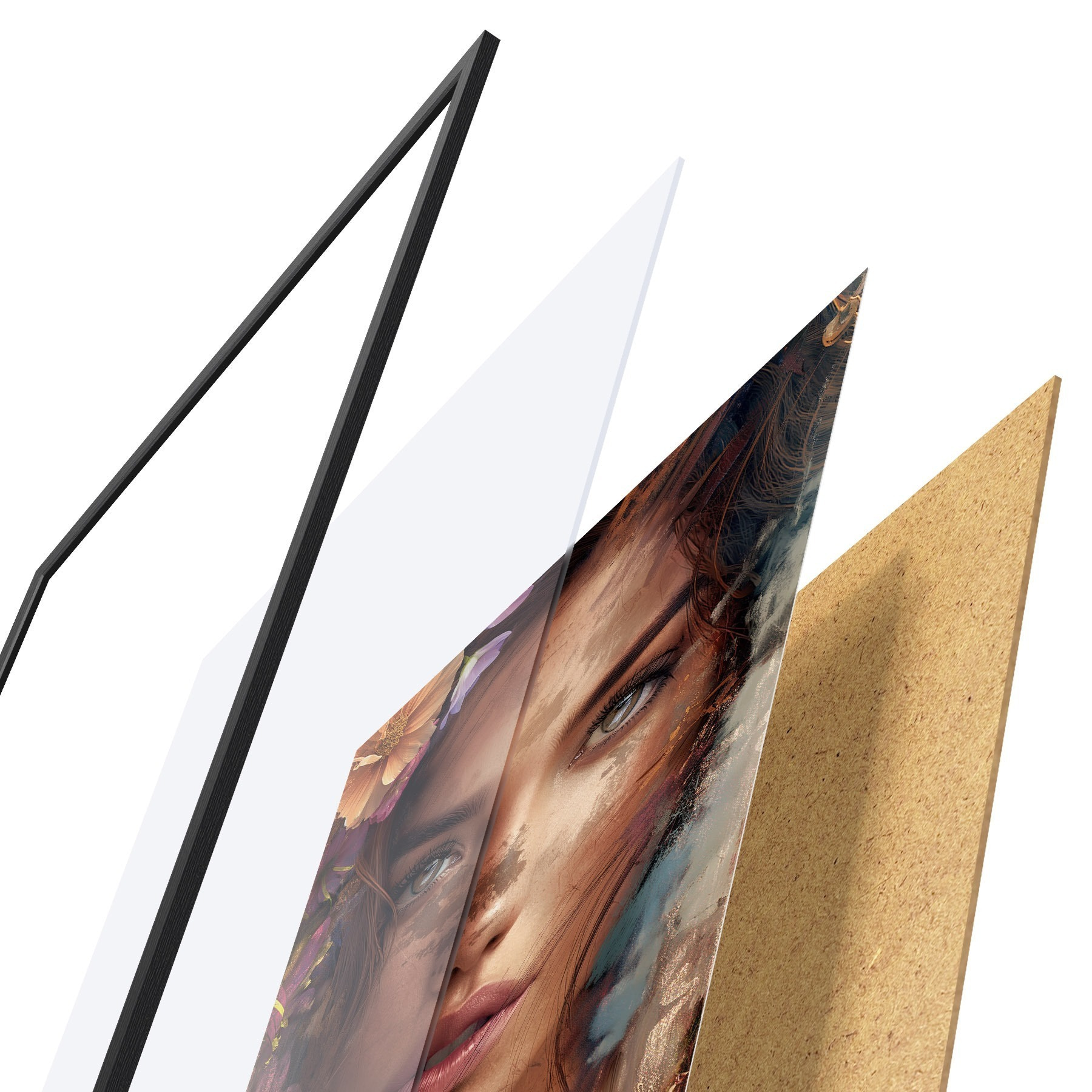 Plakat składa się z ramy, pleksi, wydrukowanego obrazu i podkładu z płyty wiórowej. Plakat można natychmiast zawiesić na ścianie dzięki uchwytom z tyłu.