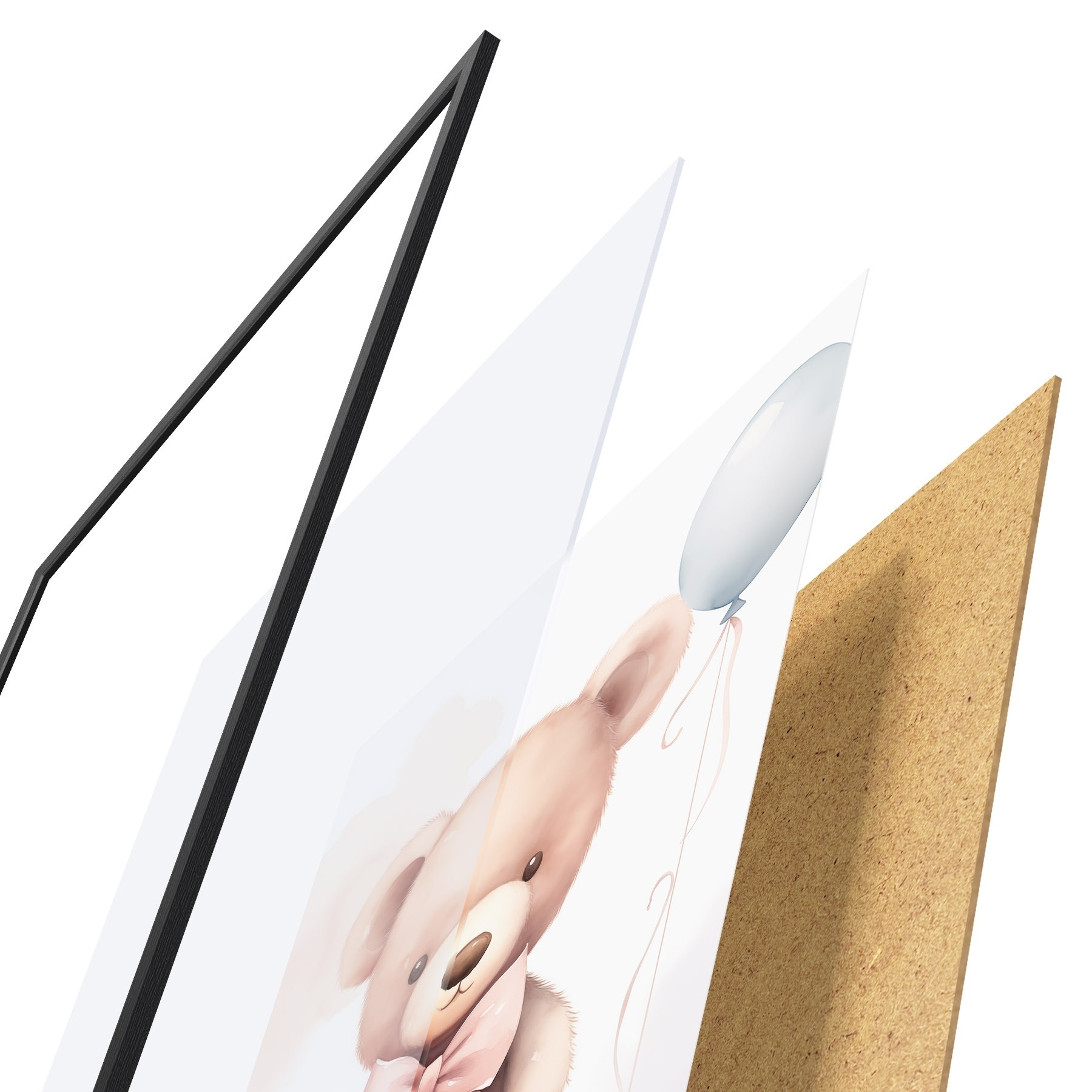 Plakat składa się z ramy, pleksi, wydrukowanego obrazu i podkładu z płyty wiórowej. Plakat można natychmiast zawiesić na ścianie dzięki uchwytom z tyłu.