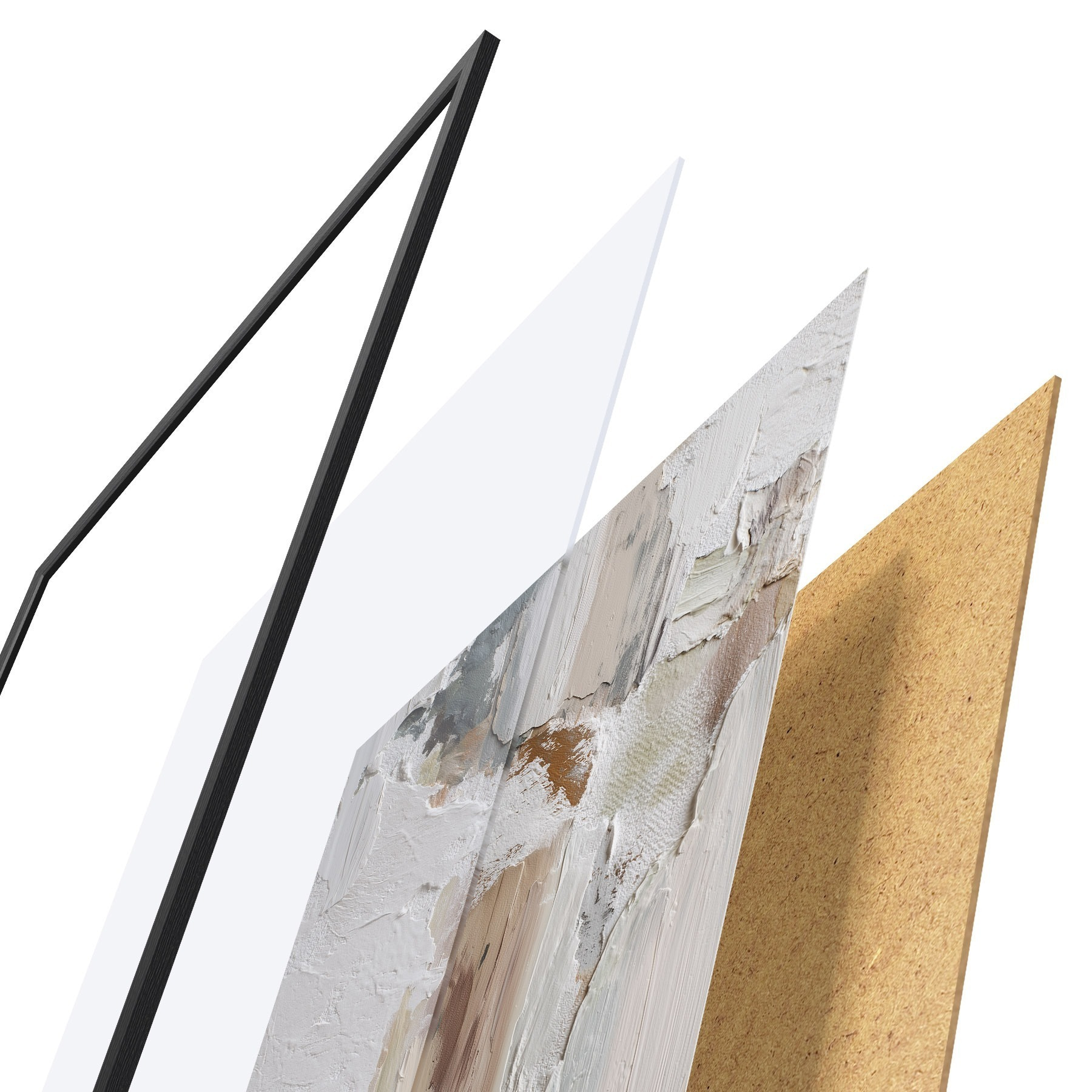 Plakat składa się z ramy, pleksi, wydrukowanego obrazu i podkładu z płyty wiórowej. Plakat można natychmiast zawiesić na ścianie dzięki uchwytom z tyłu.