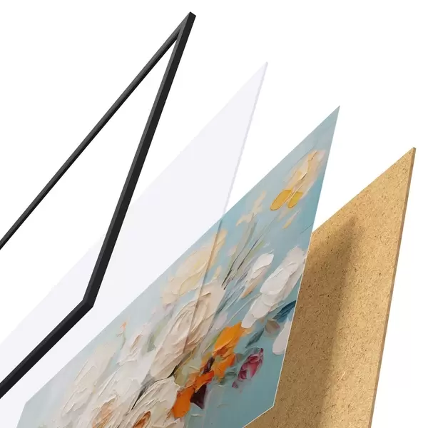 Plakat składa się z ramy, pleksi, wydrukowanego obrazu i podkładu z płyty wiórowej. Plakat można natychmiast zawiesić na ścianie dzięki uchwytom z tyłu.