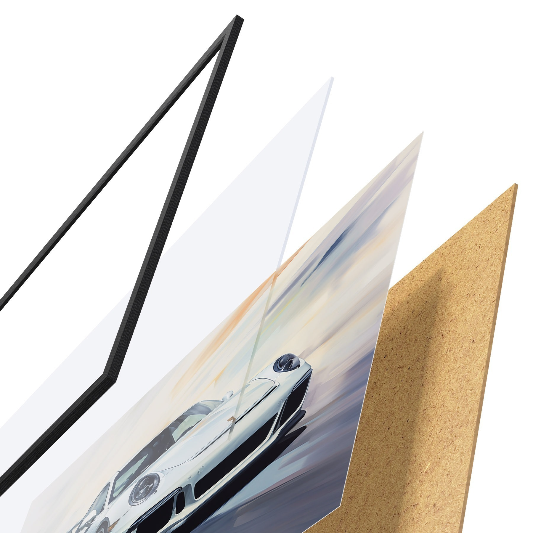 Plakat składa się z ramy, pleksi, wydrukowanego obrazu i podkładu z płyty wiórowej. Plakat można natychmiast zawiesić na ścianie dzięki uchwytom z tyłu.