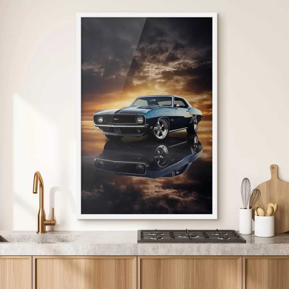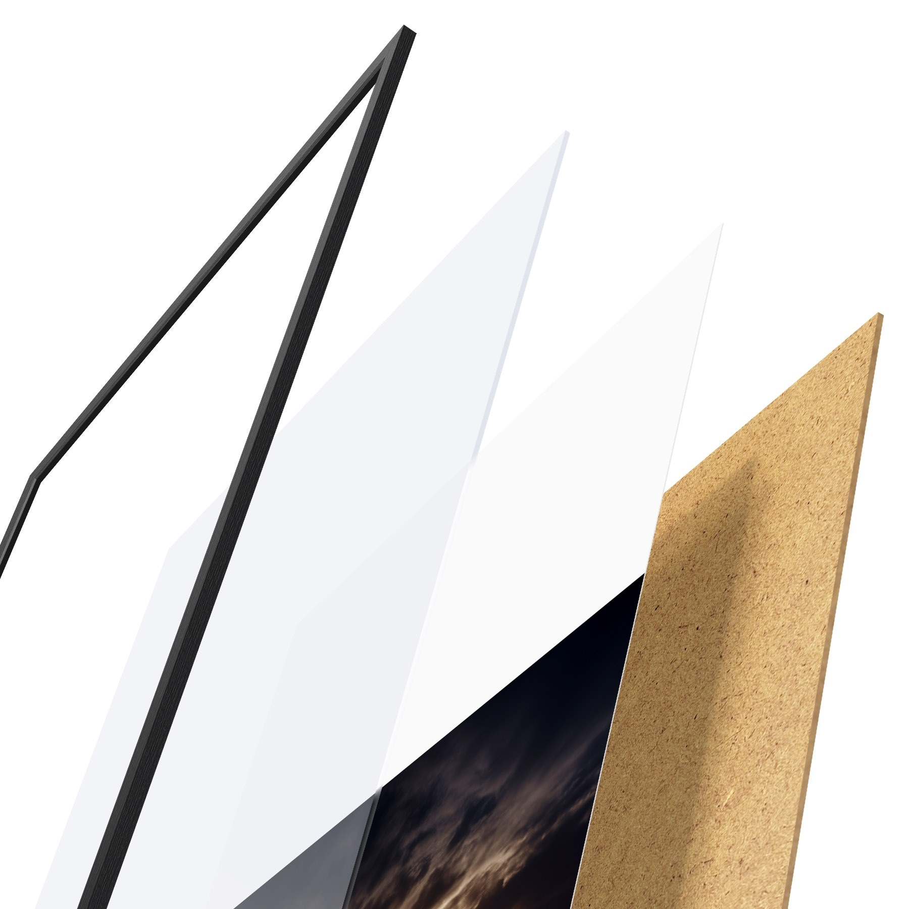 Plakat składa się z ramy, pleksi, wydrukowanego obrazu i podkładu z płyty wiórowej. Plakat można natychmiast zawiesić na ścianie dzięki uchwytom z tyłu.