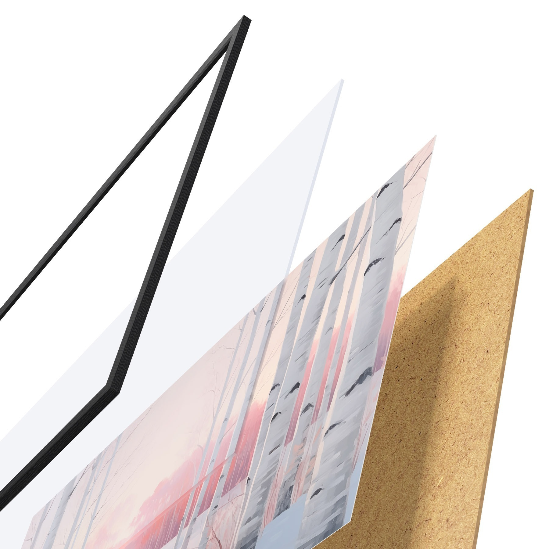 Plakat składa się z ramy, pleksi, wydrukowanego obrazu i podkładu z płyty wiórowej. Plakat można natychmiast zawiesić na ścianie dzięki uchwytom z tyłu.