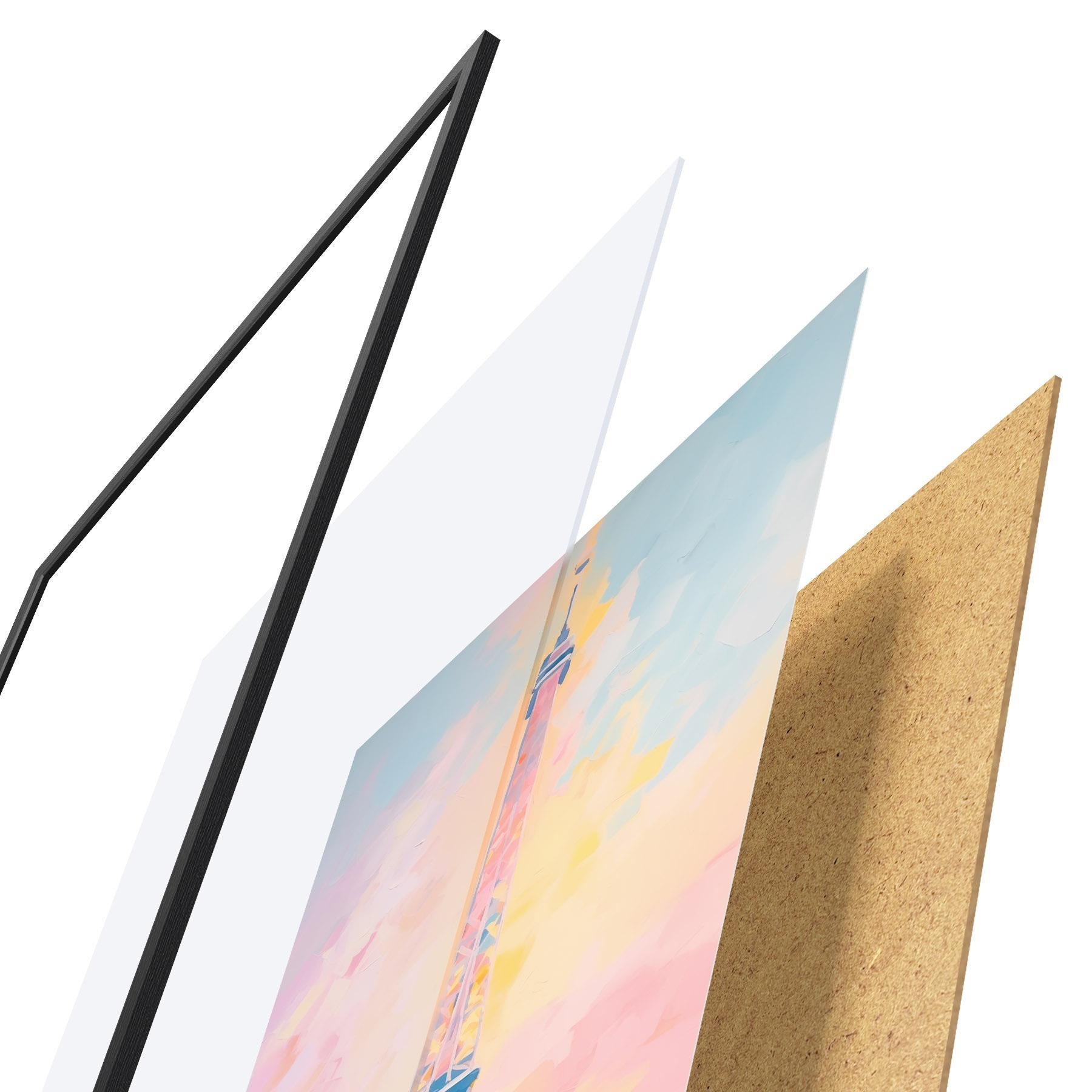 Plakat składa się z ramy, pleksi, wydrukowanego obrazu i podkładu z płyty wiórowej. Plakat można natychmiast zawiesić na ścianie dzięki uchwytom z tyłu.