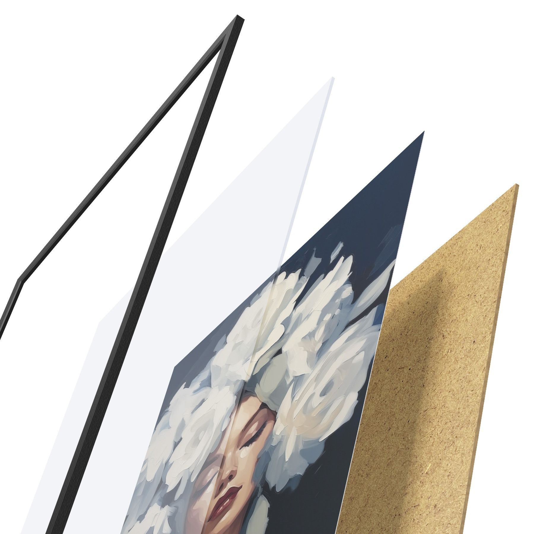 Plakat składa się z ramy, pleksi, wydrukowanego obrazu i podkładu z płyty wiórowej. Plakat można natychmiast zawiesić na ścianie dzięki uchwytom z tyłu.