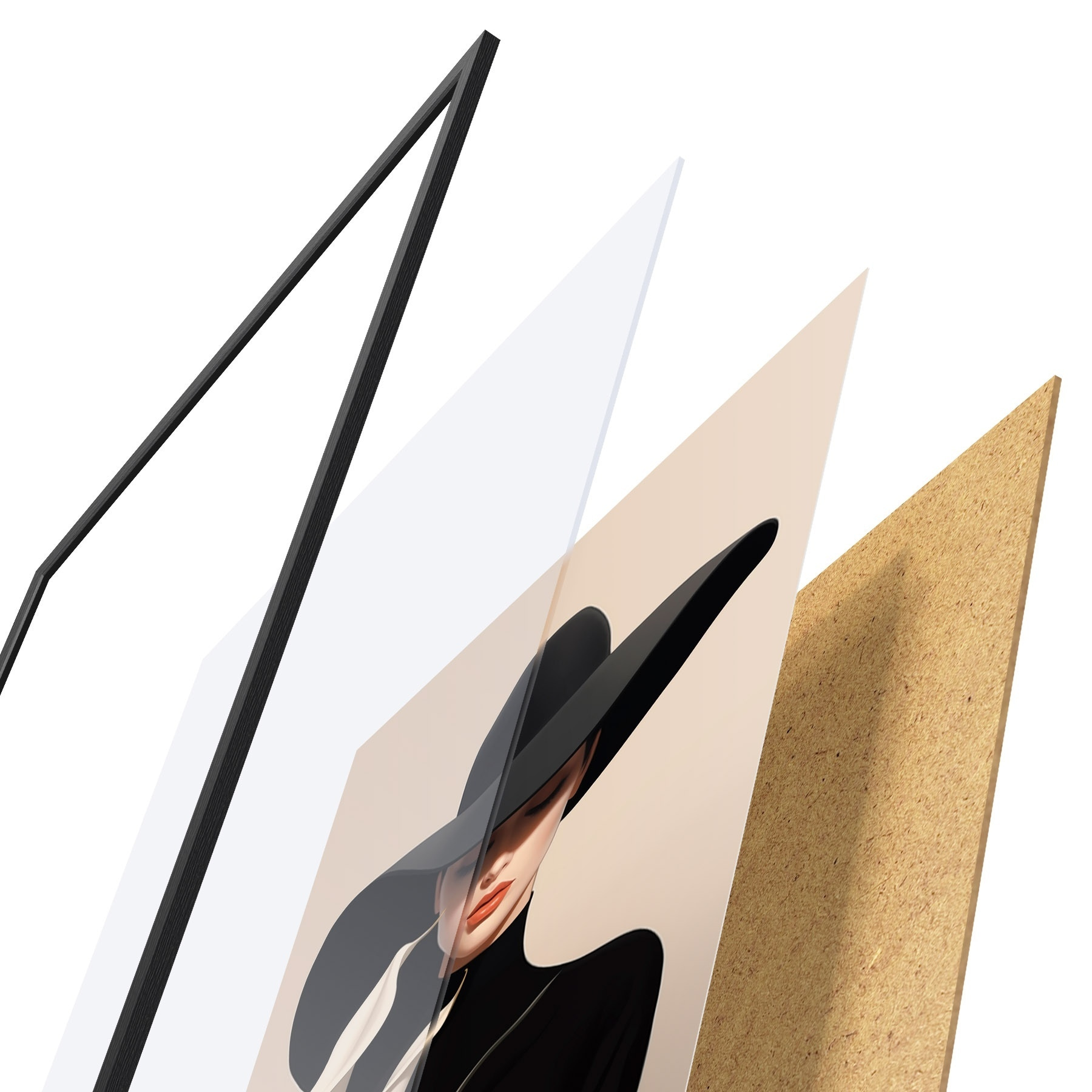Plakat składa się z ramy, pleksi, wydrukowanego obrazu i podkładu z płyty wiórowej. Plakat można natychmiast zawiesić na ścianie dzięki uchwytom z tyłu.