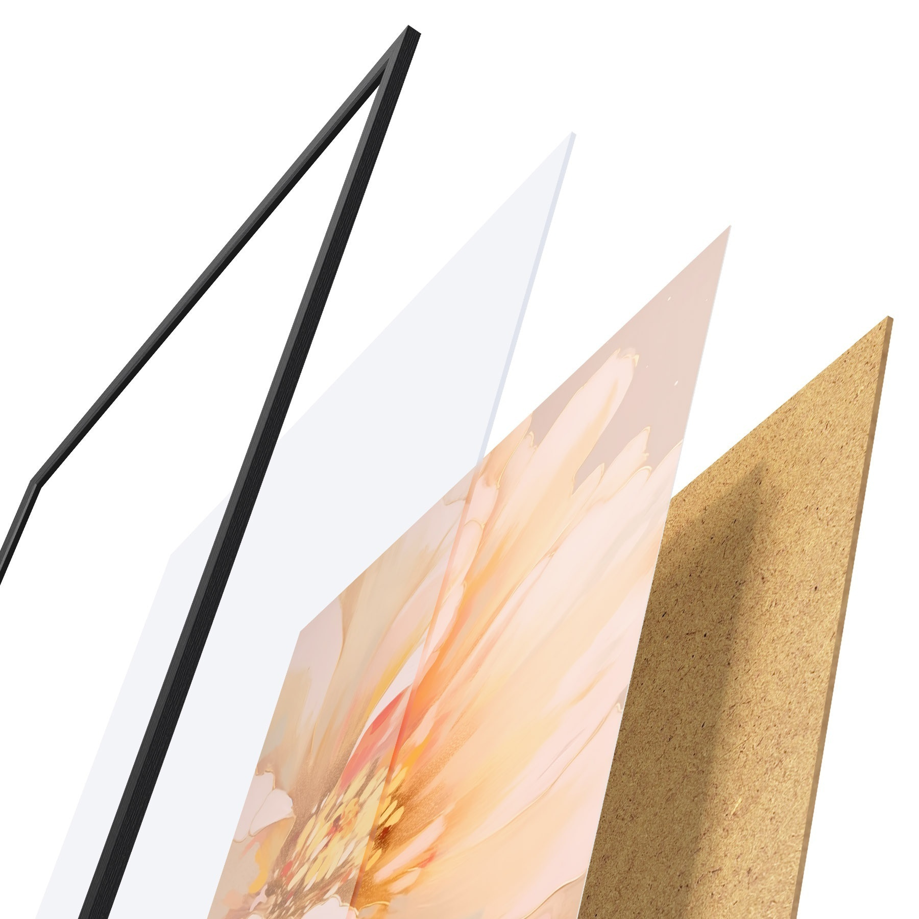 Plakat składa się z ramy, pleksi, wydrukowanego obrazu i podkładu z płyty wiórowej. Plakat można natychmiast zawiesić na ścianie dzięki uchwytom z tyłu.