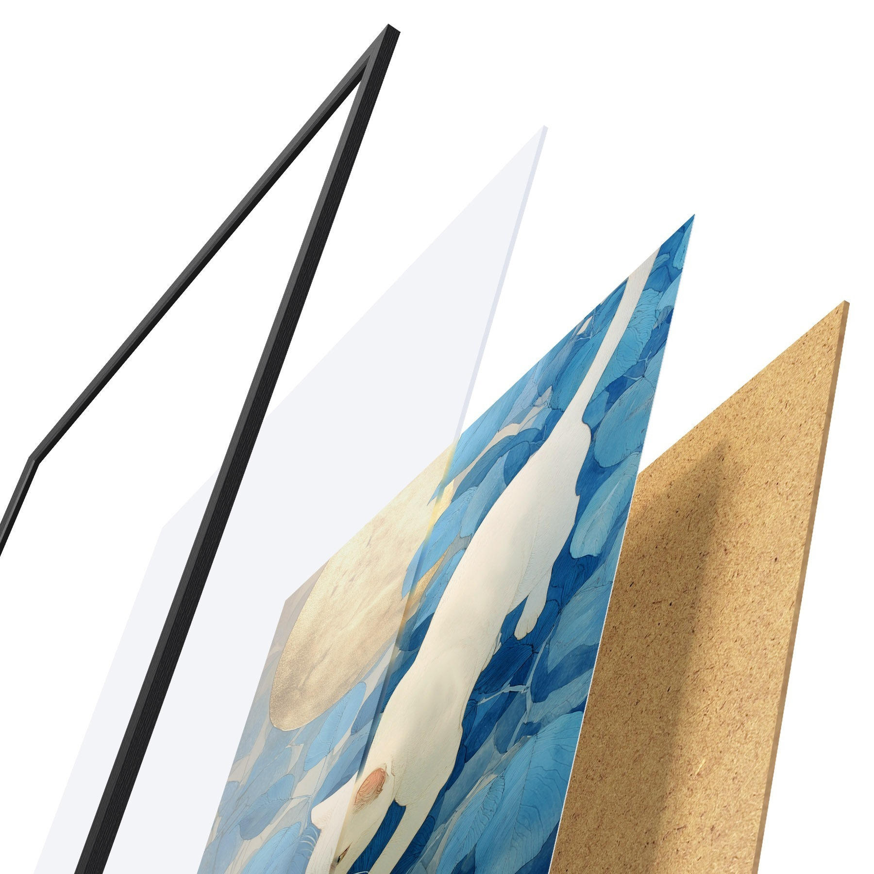 Plakat składa się z ramy, pleksi, wydrukowanego obrazu i podkładu z płyty wiórowej. Plakat można natychmiast zawiesić na ścianie dzięki uchwytom z tyłu.
