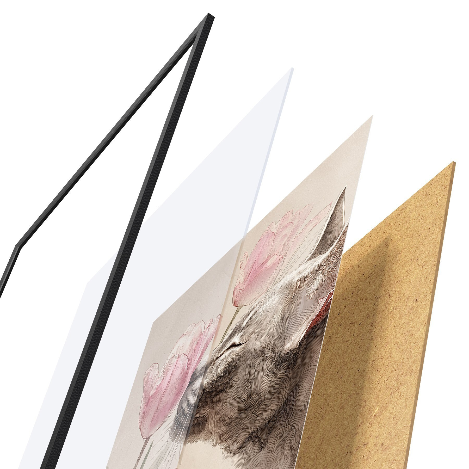 Plakat składa się z ramy, pleksi, wydrukowanego obrazu i podkładu z płyty wiórowej. Plakat można natychmiast zawiesić na ścianie dzięki uchwytom z tyłu.