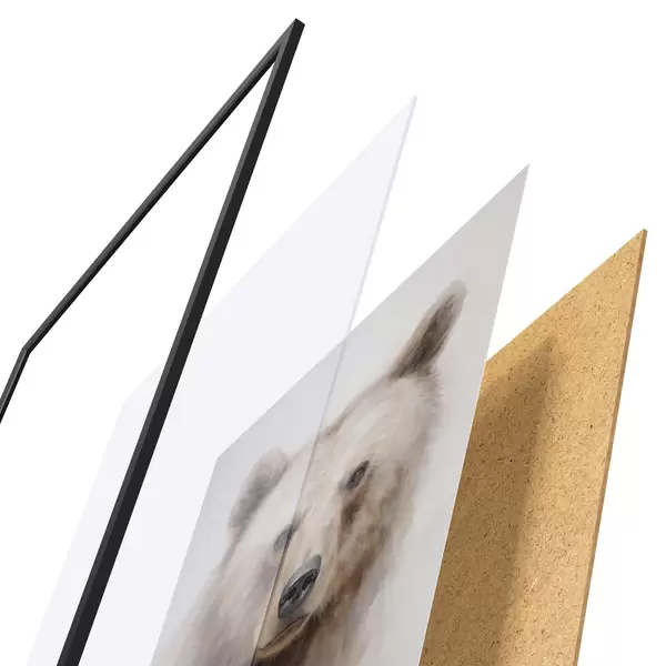 Plakat składa się z ramy, pleksi, wydrukowanego obrazu i podkładu z płyty wiórowej. Plakat można natychmiast zawiesić na ścianie dzięki uchwytom z tyłu.