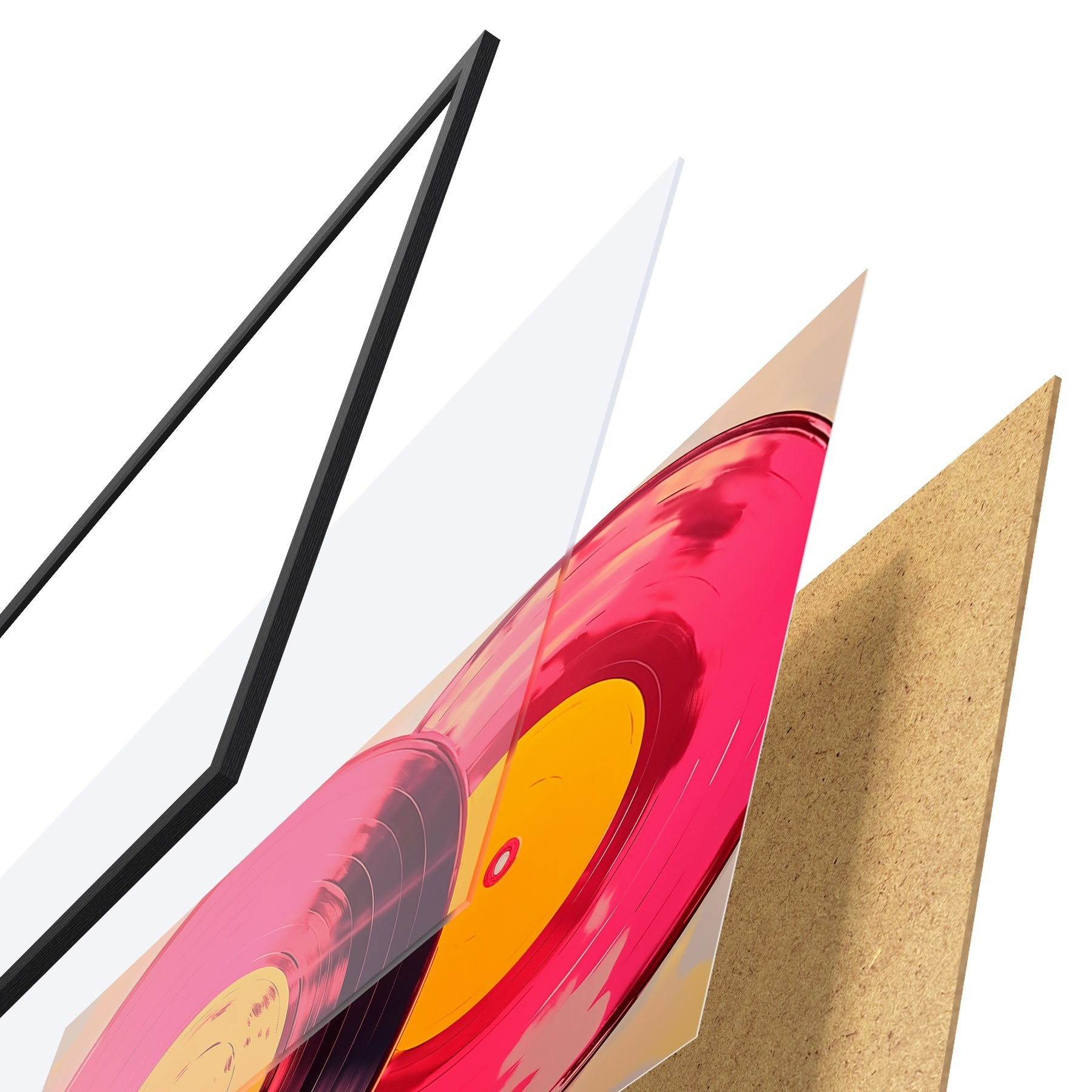 Plakat składa się z ramy, pleksi, wydrukowanego obrazu i podkładu z płyty wiórowej. Plakat można natychmiast zawiesić na ścianie dzięki uchwytom z tyłu.