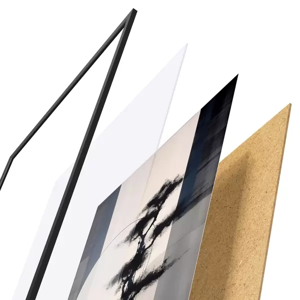 Plakat składa się z ramy, pleksi, wydrukowanego obrazu i podkładu z płyty wiórowej. Plakat można natychmiast zawiesić na ścianie dzięki uchwytom z tyłu.