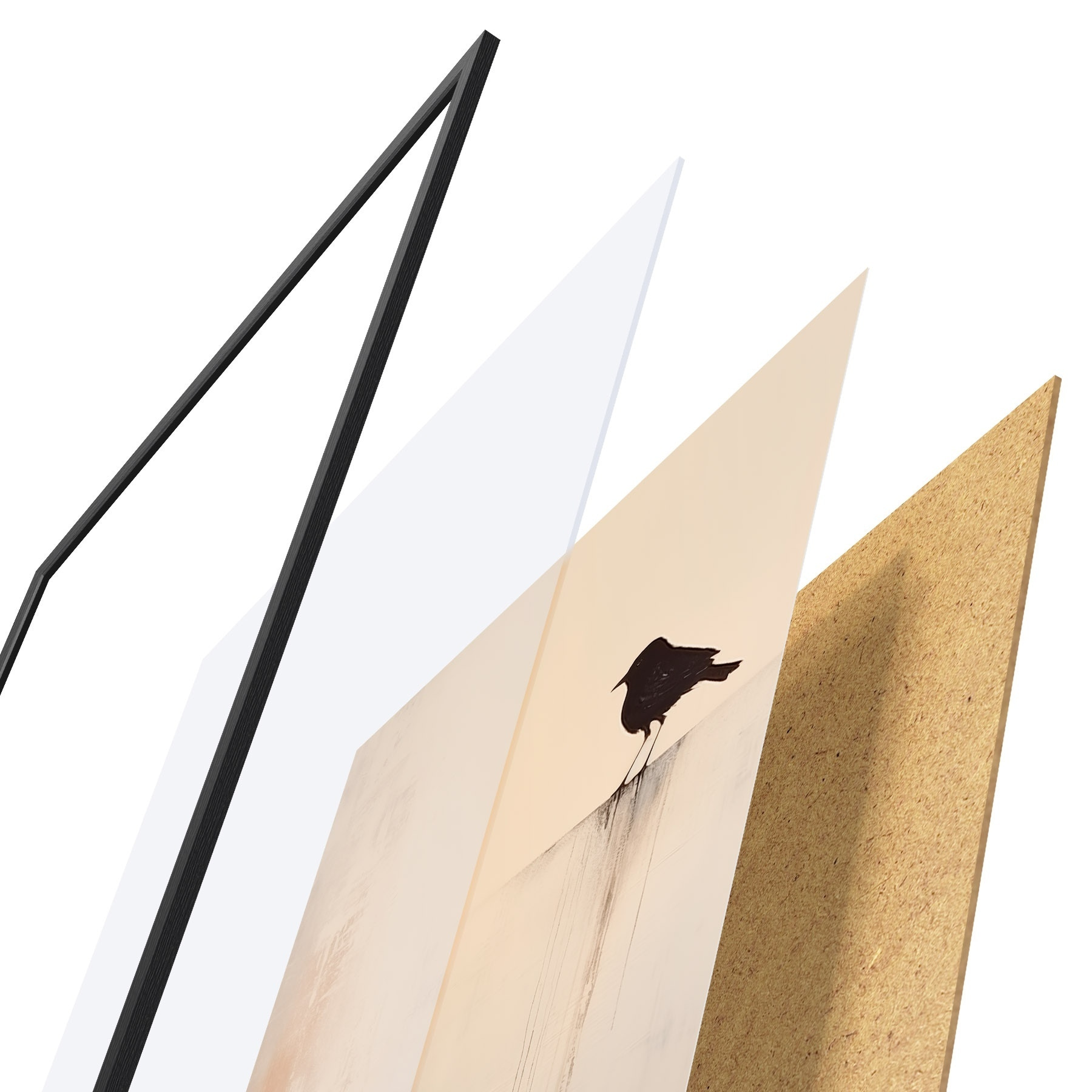 Plakat składa się z ramy, pleksi, wydrukowanego obrazu i podkładu z płyty wiórowej. Plakat można natychmiast zawiesić na ścianie dzięki uchwytom z tyłu.