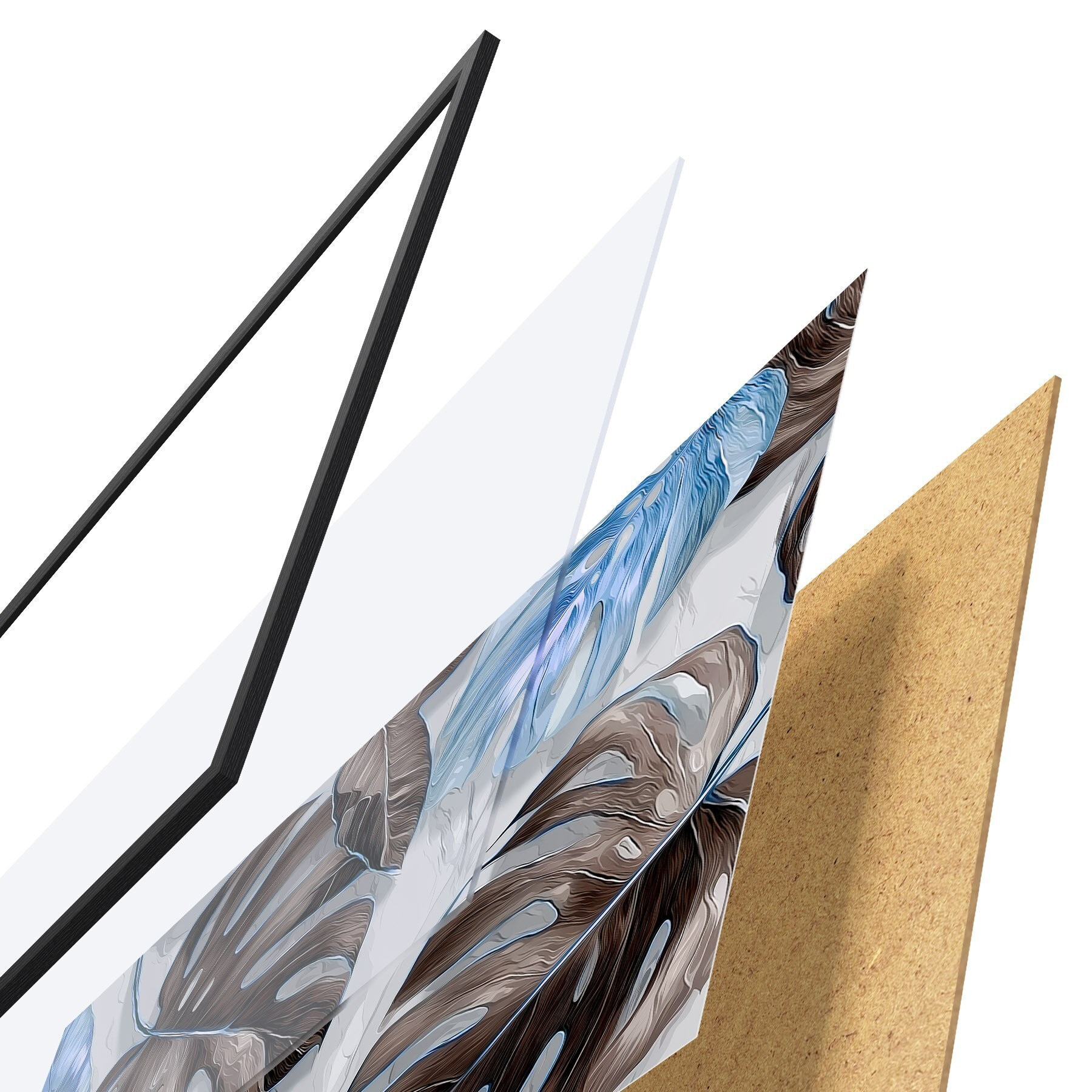 Plakat składa się z ramy, pleksi, wydrukowanego obrazu i podkładu z płyty wiórowej. Plakat można natychmiast zawiesić na ścianie dzięki uchwytom z tyłu.