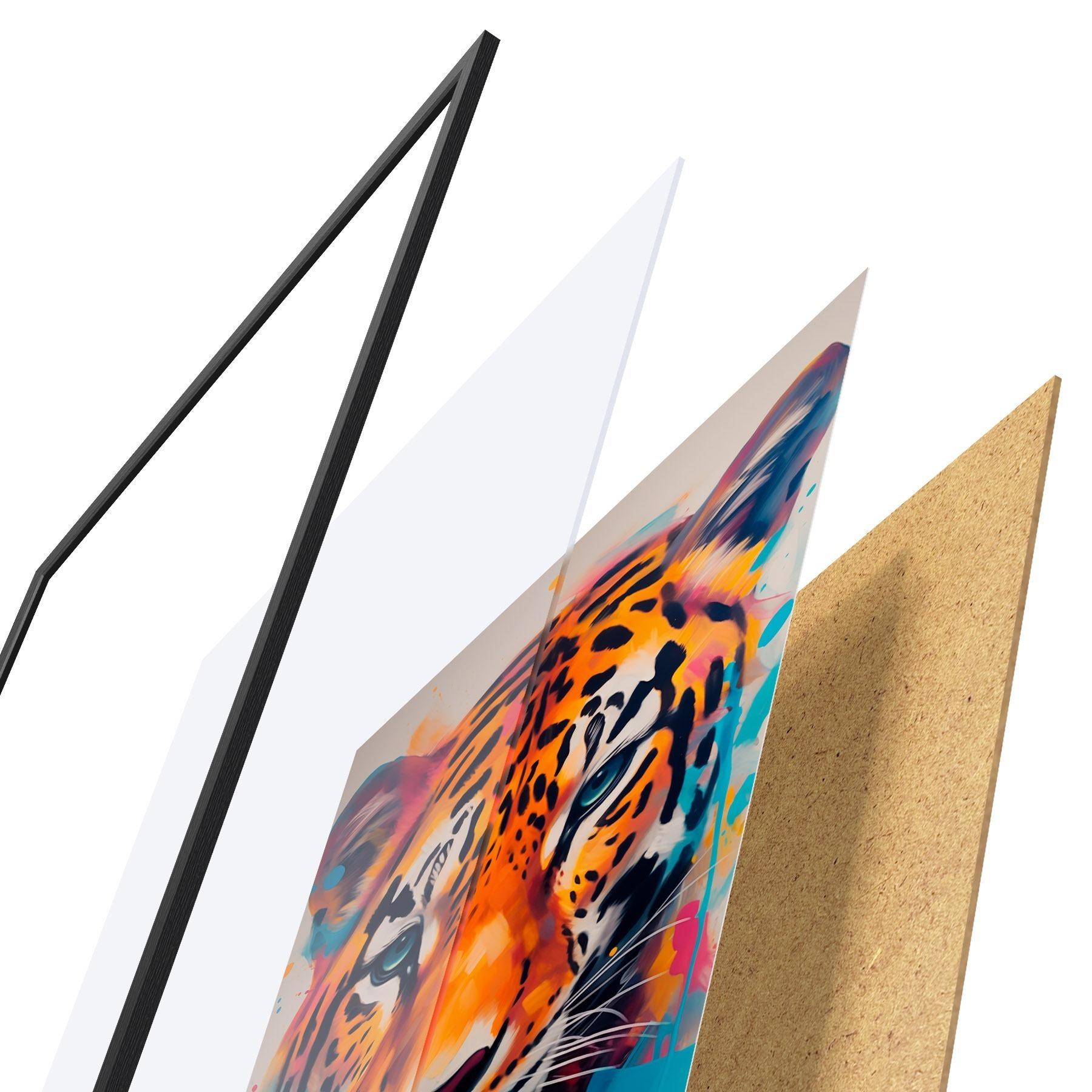 Plakat składa się z ramy, pleksi, wydrukowanego obrazu i podkładu z płyty wiórowej. Plakat można natychmiast zawiesić na ścianie dzięki uchwytom z tyłu.