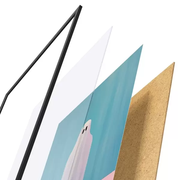 Plakat składa się z ramy, pleksi, wydrukowanego obrazu i podkładu z płyty wiórowej. Plakat można natychmiast zawiesić na ścianie dzięki uchwytom z tyłu.