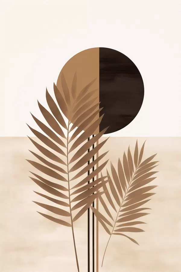 Plakat Dwa liście palmy z motywem rozciętego koła słońca f46491