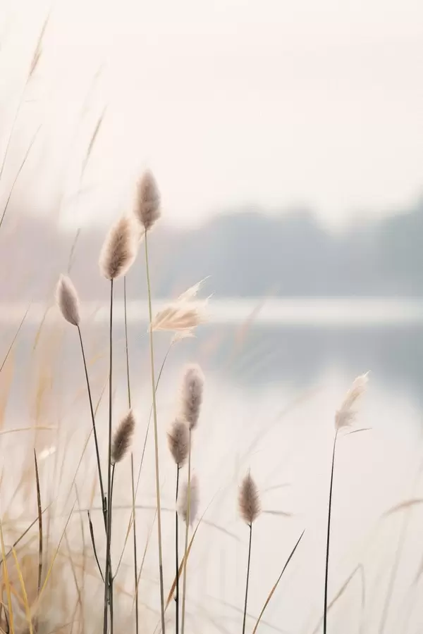 Plakat Miękkie trzciny nad mglistym brzegiem jeziora, pastelowe odcienie beżu f46504