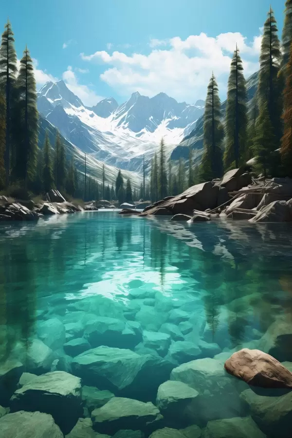 Plakat Czysta alpejska rzeka ze skalistym dnem i ośnieżonymi szczytami f46514