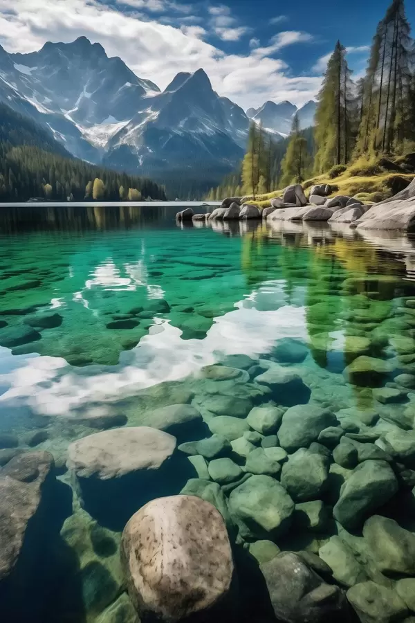 Poster Szmaragdowe alpejskie jezioro z kamieniami na dnie i wysokimi szczytami Nr f46515