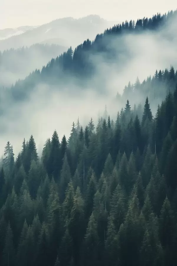 Poster Mgła nad zboczami porośniętymi drzewami iglastymi, głębokie odcienie zieleni Nr f46516