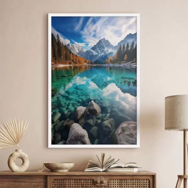 Plakat Górskie jezioro z turkusową wodą i jesiennymi modrzewiami f46517
