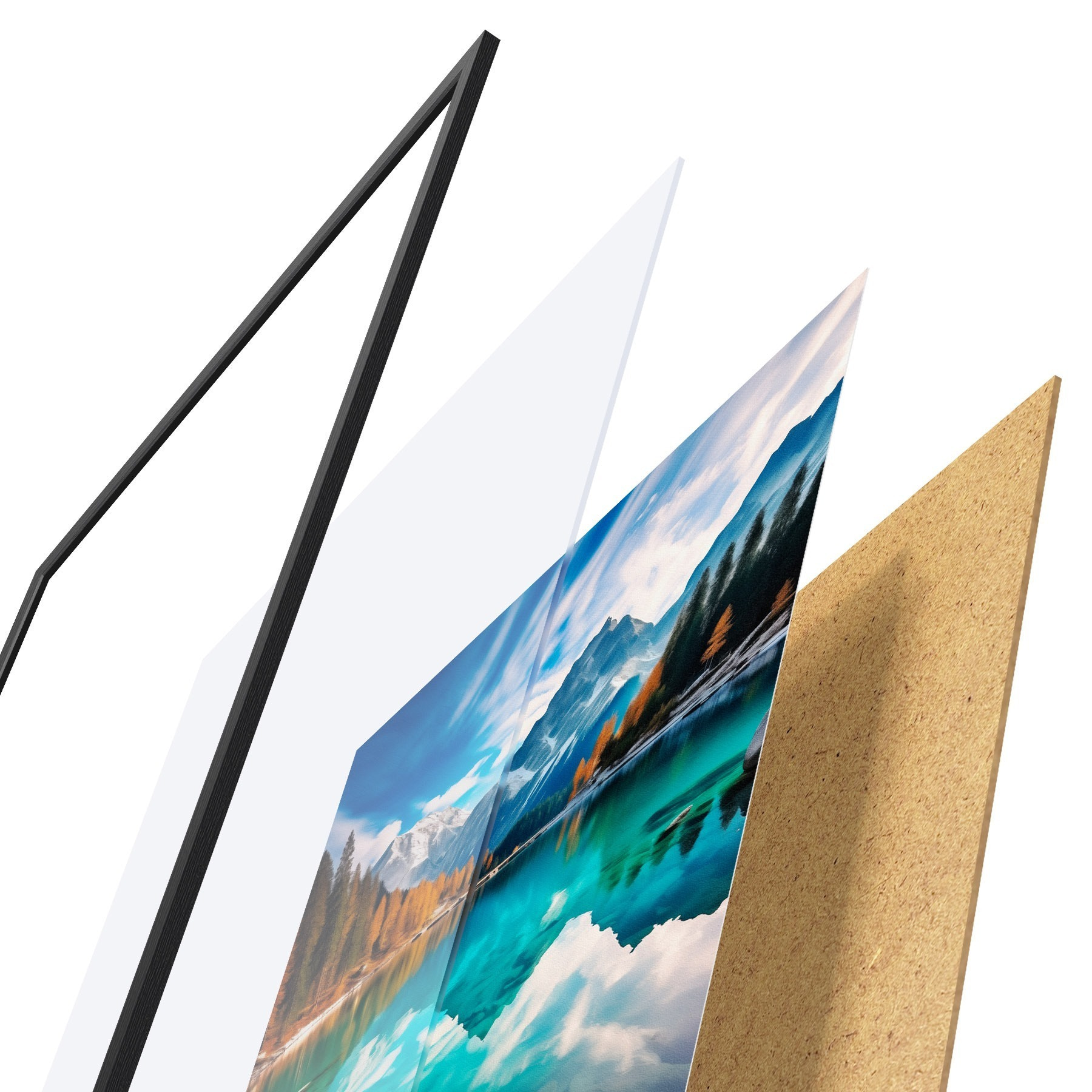 Plakat składa się z ramy, pleksi, wydrukowanego obrazu i podkładu z płyty wiórowej. Plakat można natychmiast zawiesić na ścianie dzięki uchwytom z tyłu.