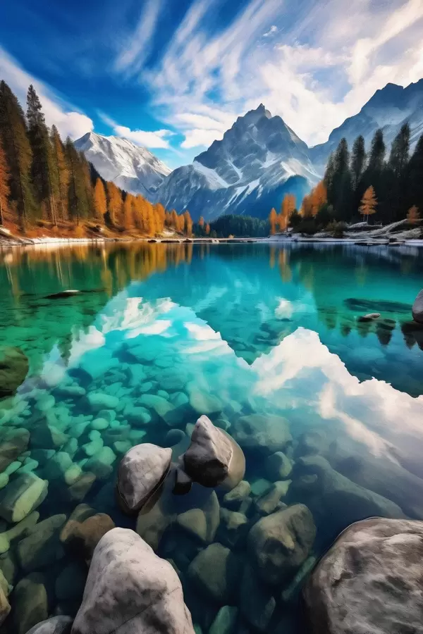 Poster Górskie jezioro z turkusową wodą i jesiennymi modrzewiami Nr f46517