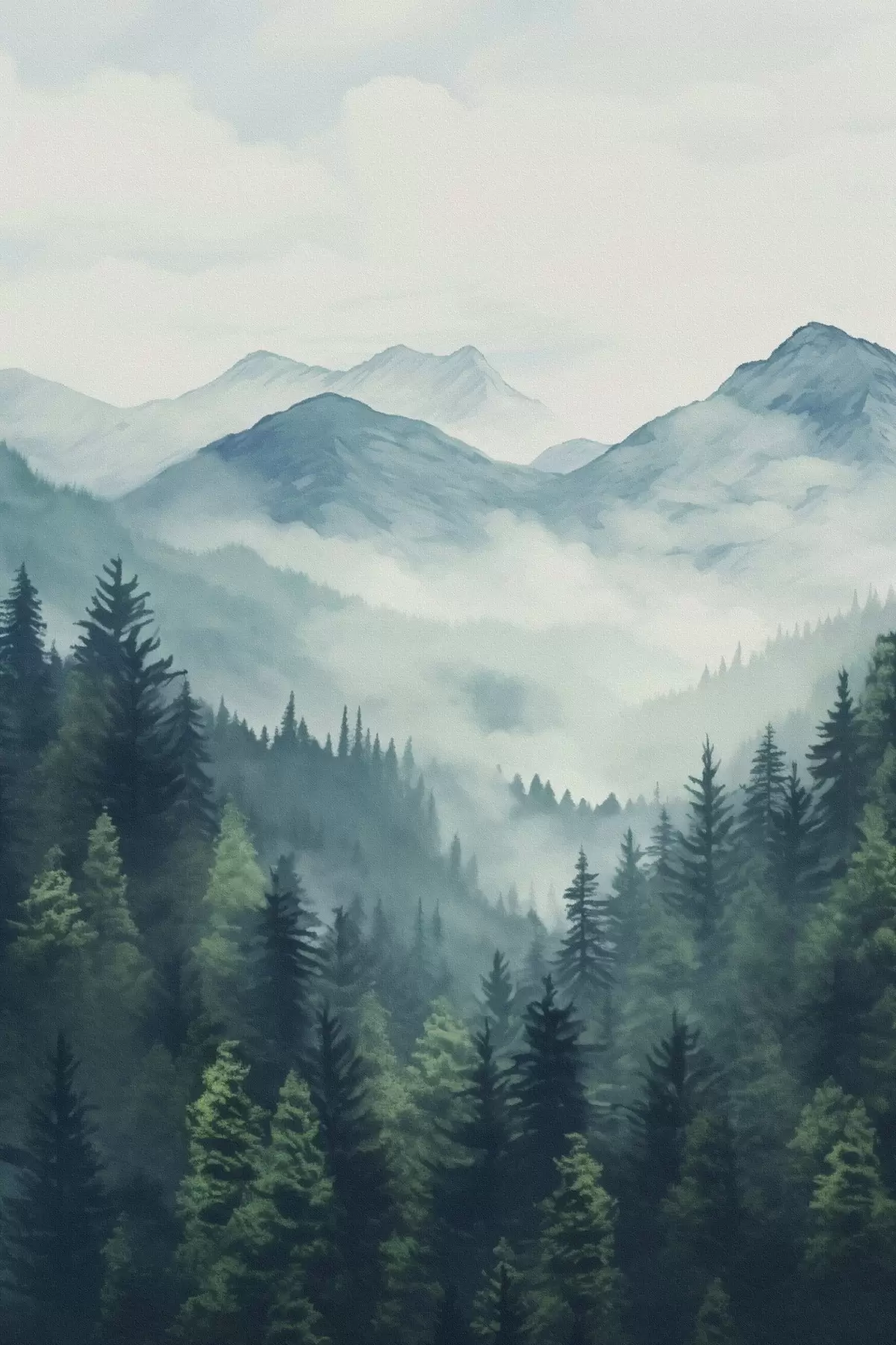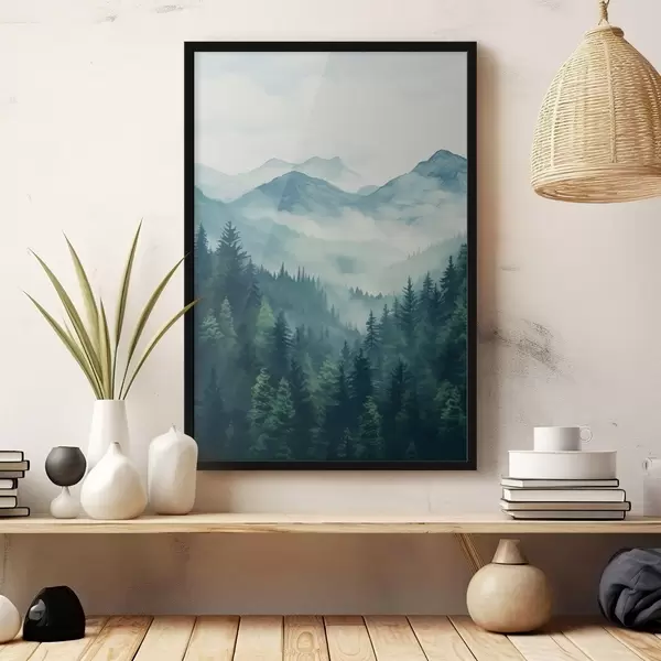 Poster Góry i lasy w delikatnej porannej mgle, namalowane akwarelą Nr f46519