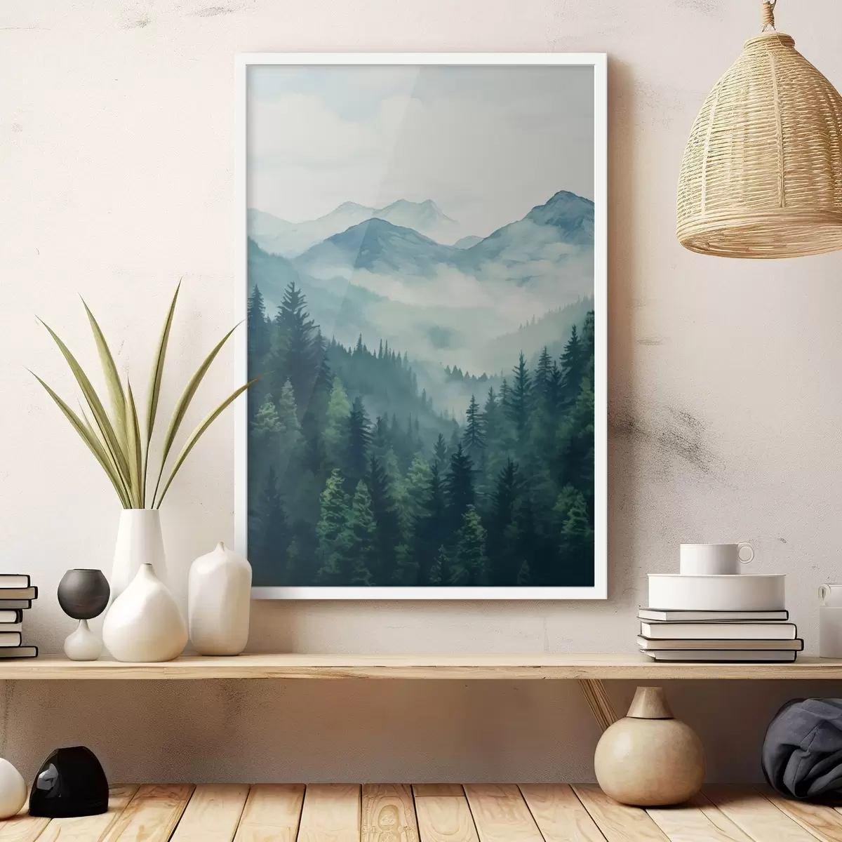 Plakat Góry i lasy w delikatnej porannej mgle, namalowane akwarelą f46519
