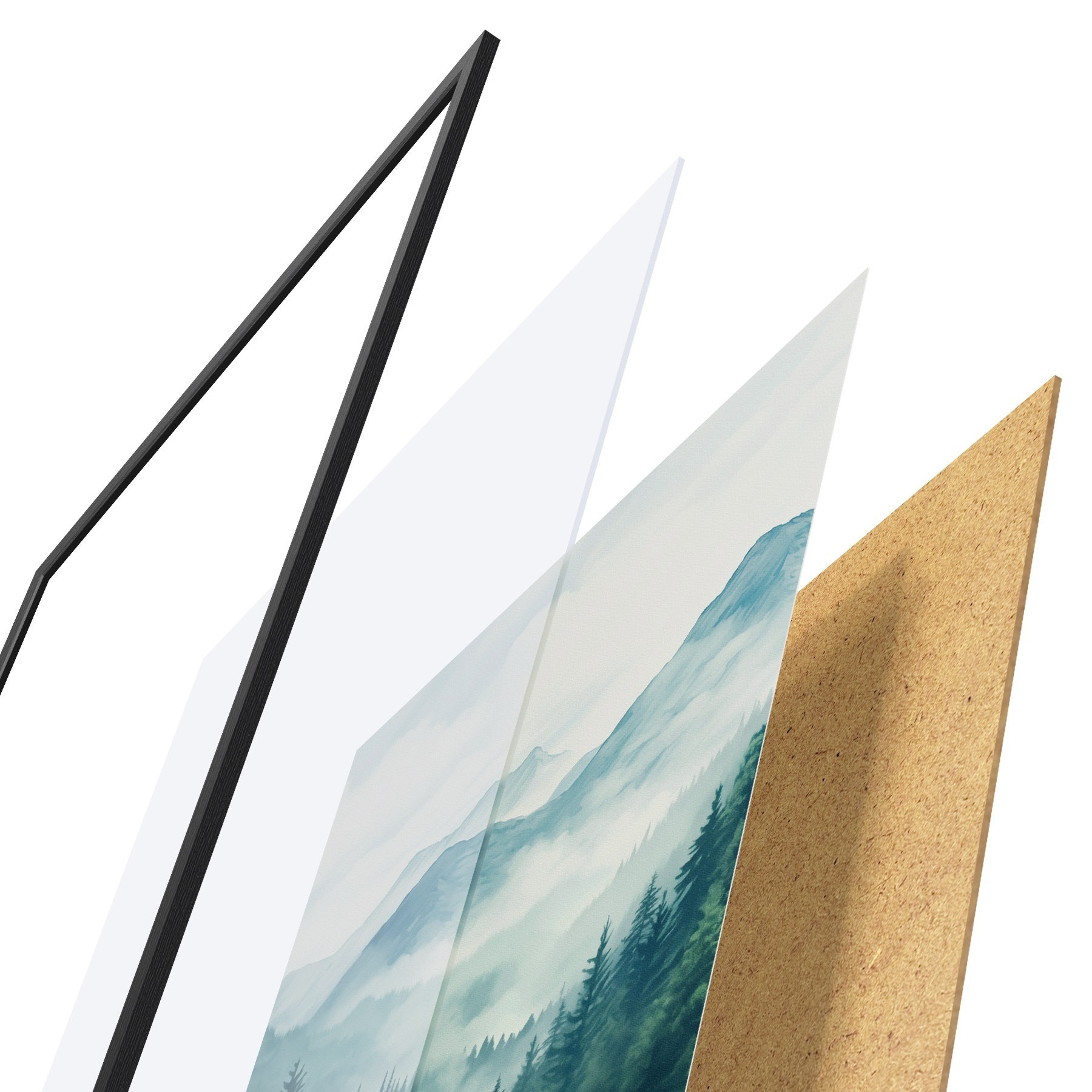 Plakat składa się z ramy, pleksi, wydrukowanego obrazu i podkładu z płyty wiórowej. Plakat można natychmiast zawiesić na ścianie dzięki uchwytom z tyłu.