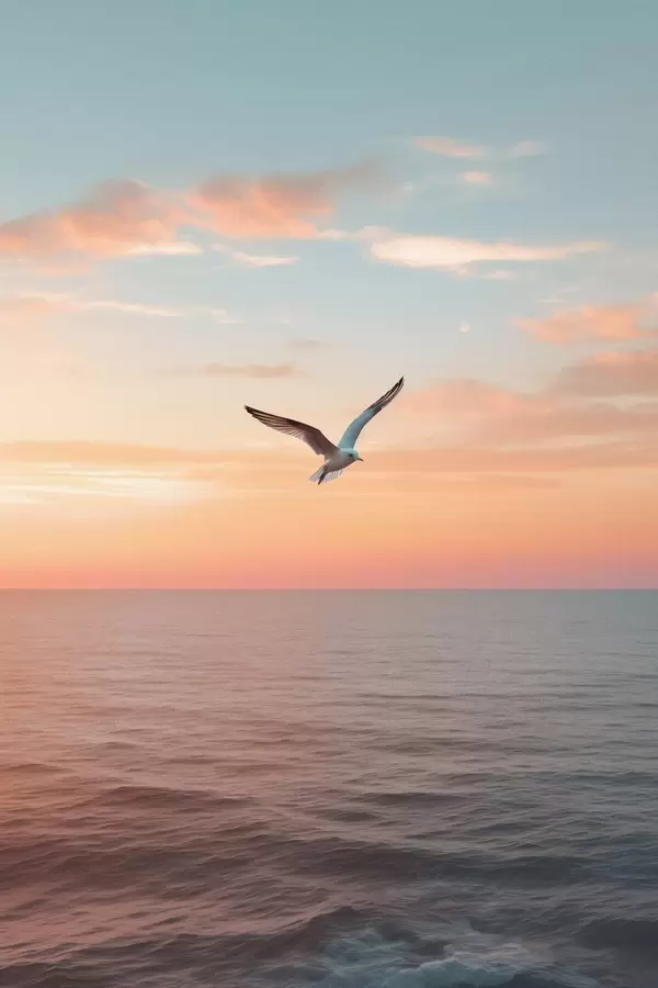 Poster Mewa nad morzem o różowo-brzoskwiniowym zachodzie słońca Nr f46520